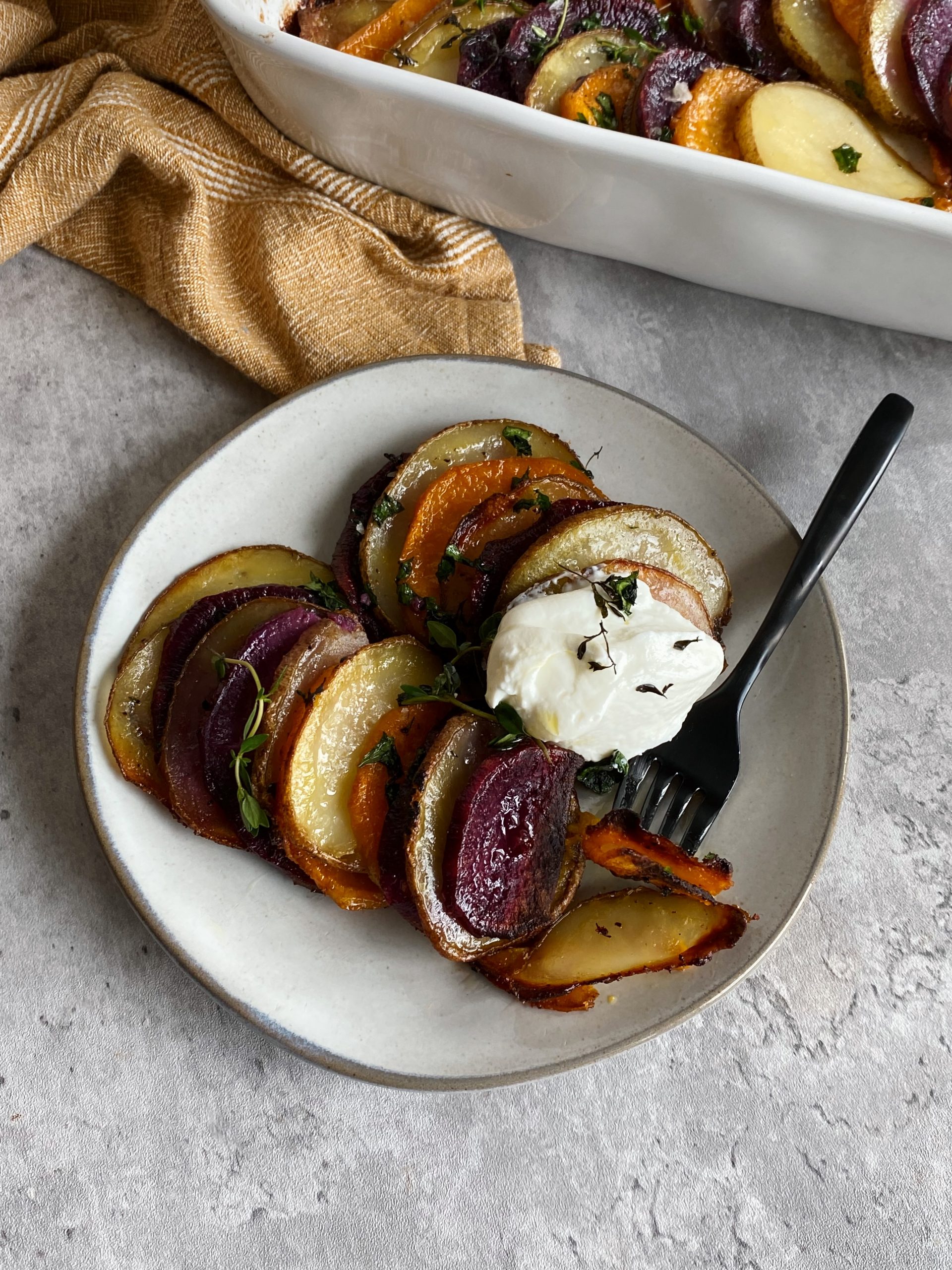 These tricolor sliced roasted potatoes are the perfect side dish for Thanksgiving! They’re lightly seasoned with a few simple spices and baked until golden and tender.