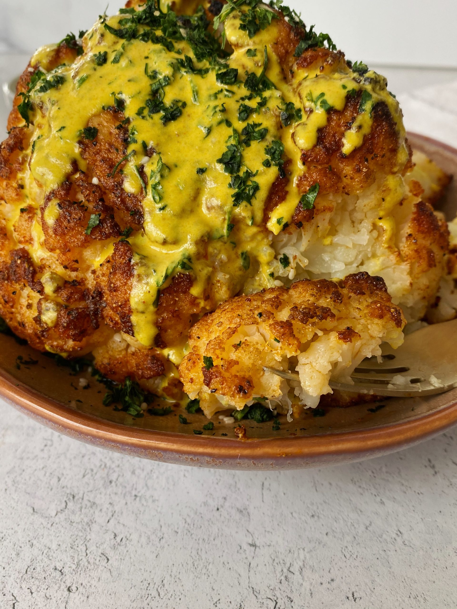 Flavorful, whole roasted cauliflower seasoned with a few simple spices and topped with the most delicious turmeric tahini sauce. This dish is a definite crowed pleaser, and a delicious way to eat more veggies!