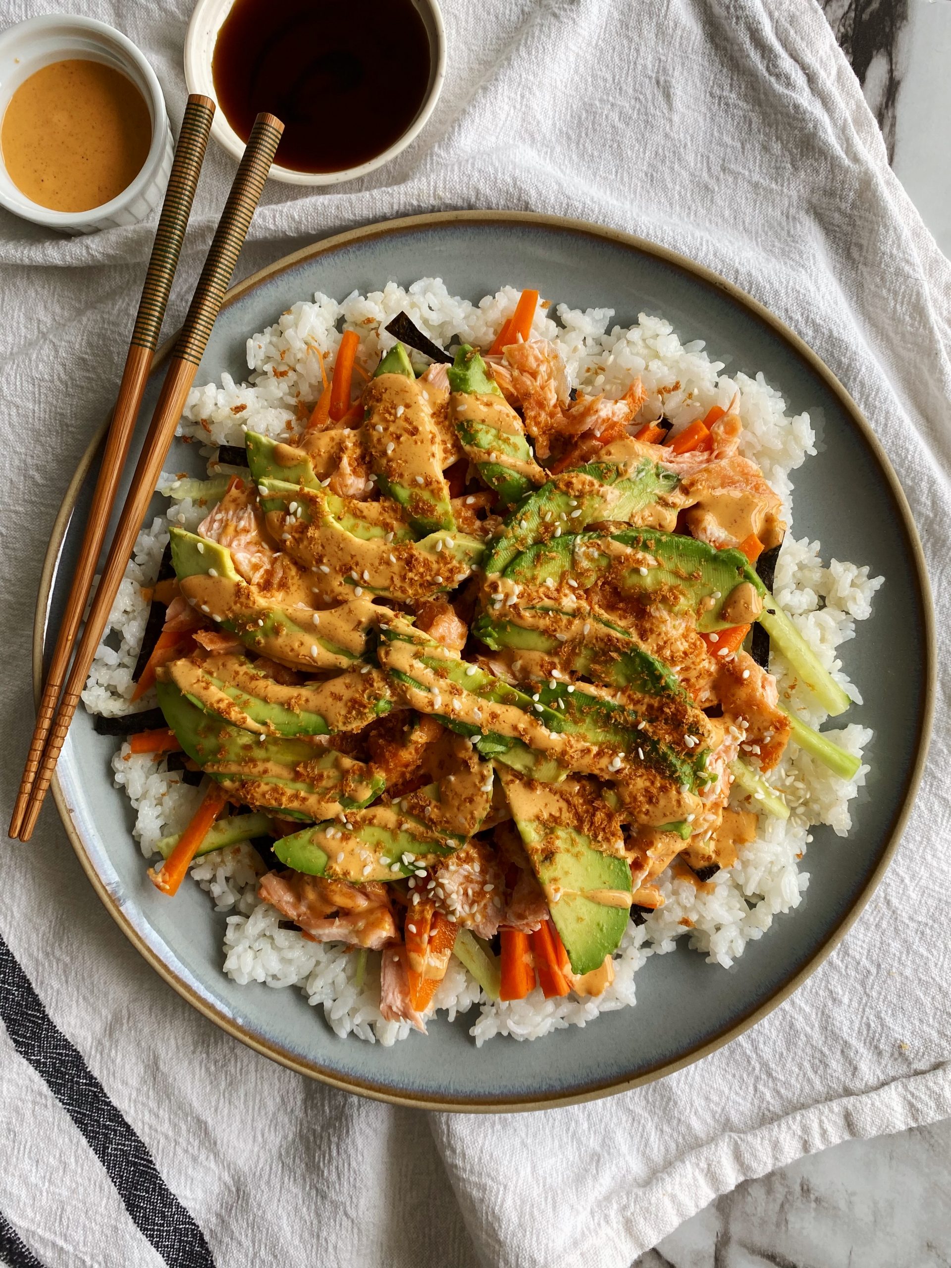 This Sushi Salad Platter gives you all the flavor of a real sushi roll, without all of the mess! It’s filled with veggies, sweet baked salmon, crunchy panko crumbs and a 2-ingredient spicy mayo. It’s perfect for a large crowd, and can be topped with any protein you like.