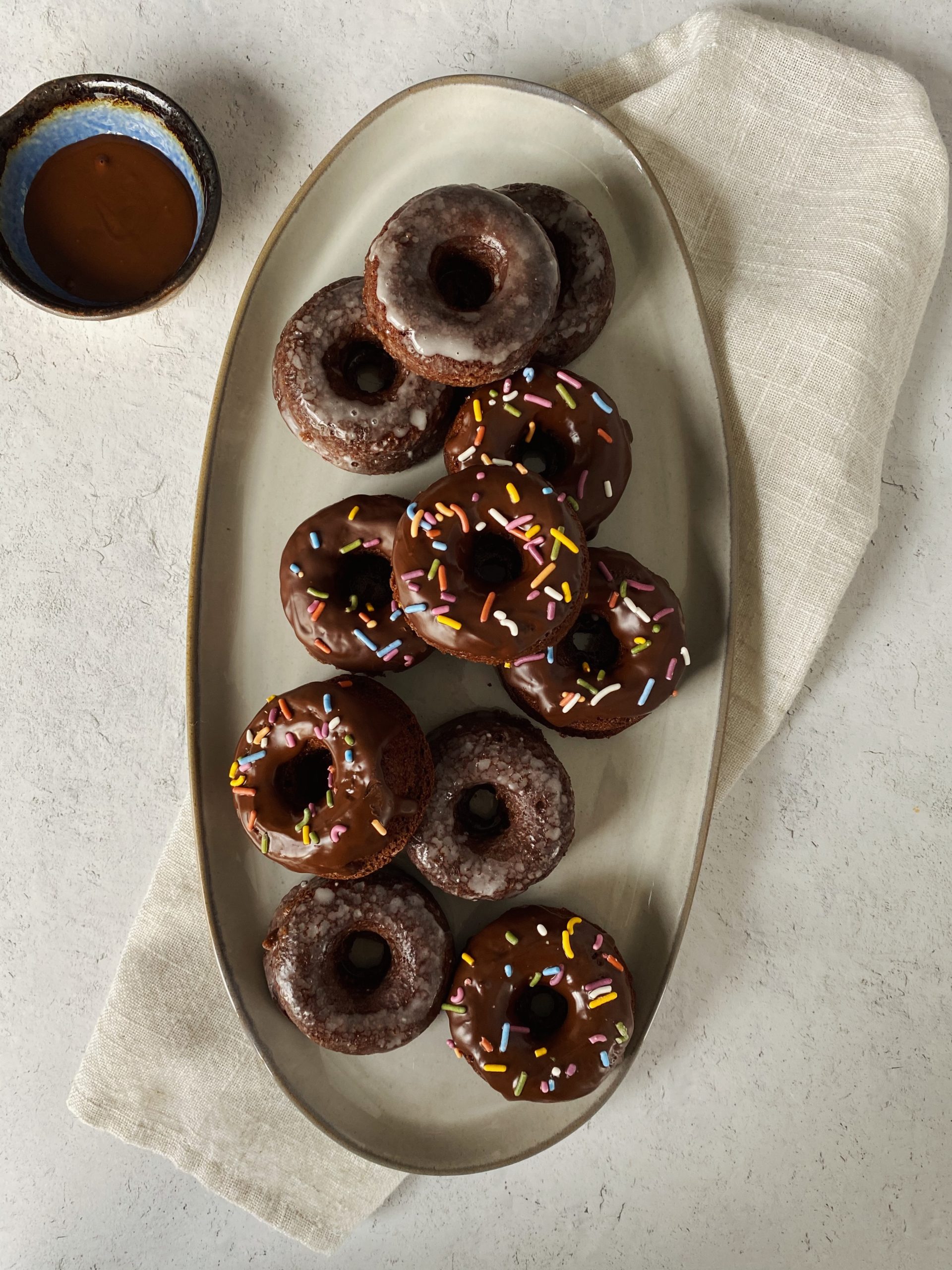 Dairy-free, gluten-free Chocolate Cake Donuts! Made with almond flour, coconut sugar, olive oil, plus a few other pantry basics.