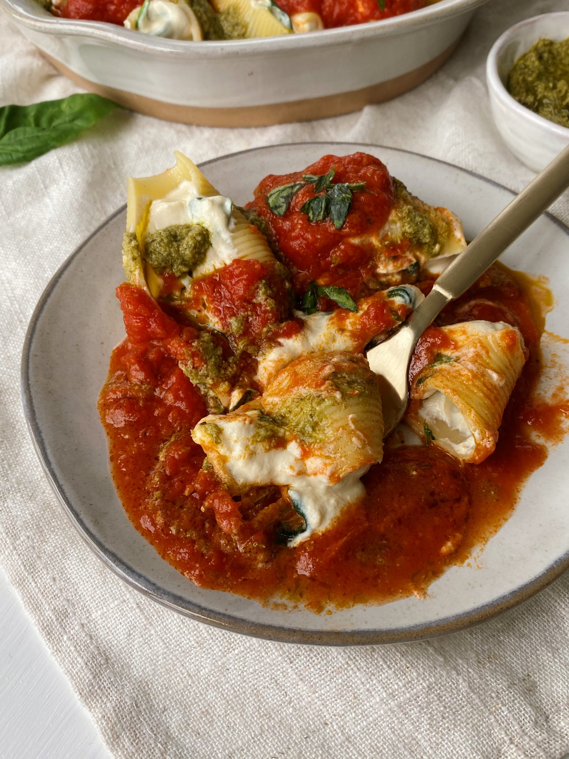 Vegan Stuffed Shells filled with a delicious homemade tofu ricotta, topped with marinara sauce and spoonfuls of pesto! You can use your favorite gluten-free shells, or roll them between zucchini strips!