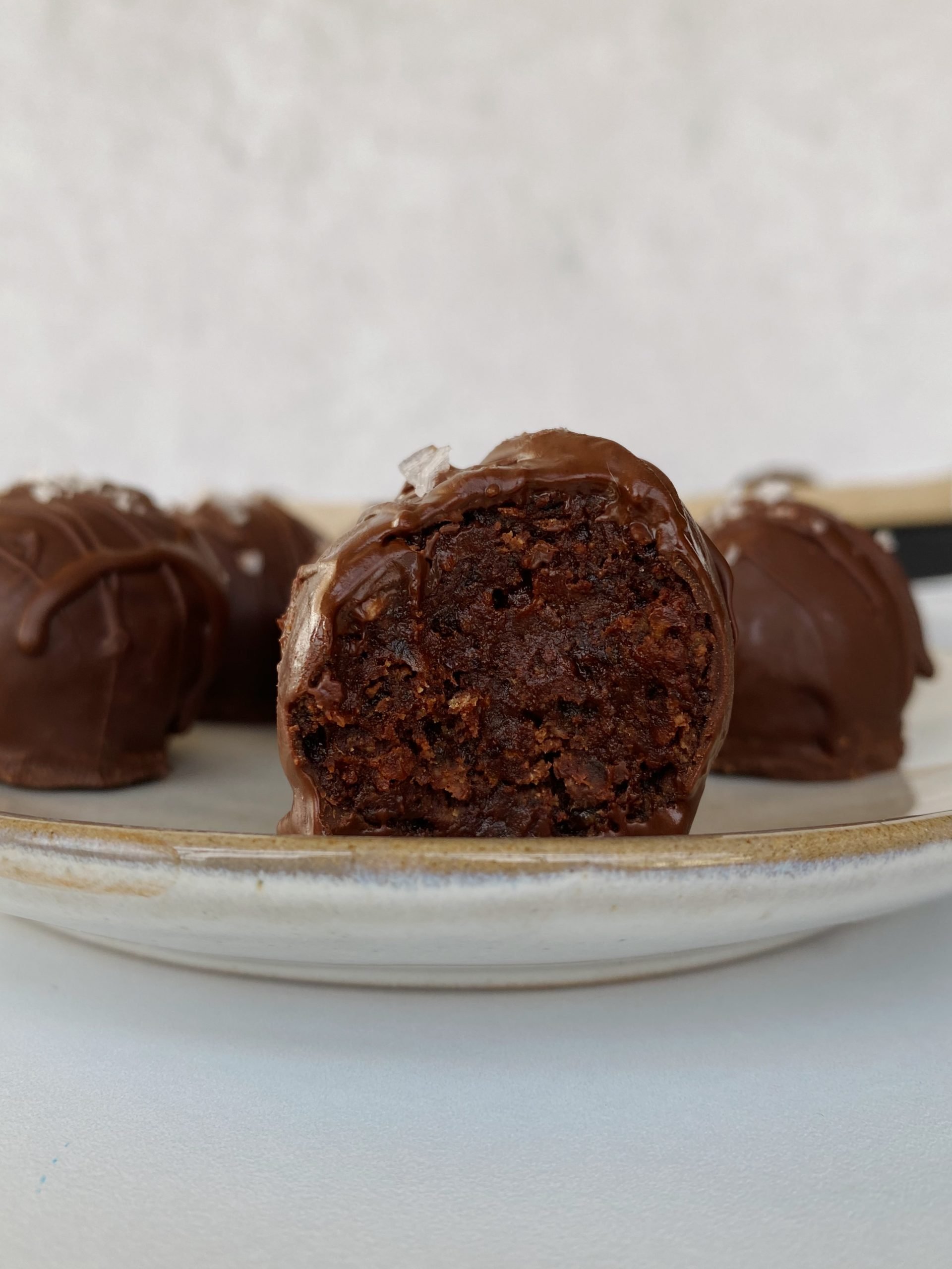 These Vegan Chocolate Truffles are made from dates and almond butter, and are so rich & decadent. They’re naturally gluten-free, and finished off with a layer of melted dark chocolate and sea salt.