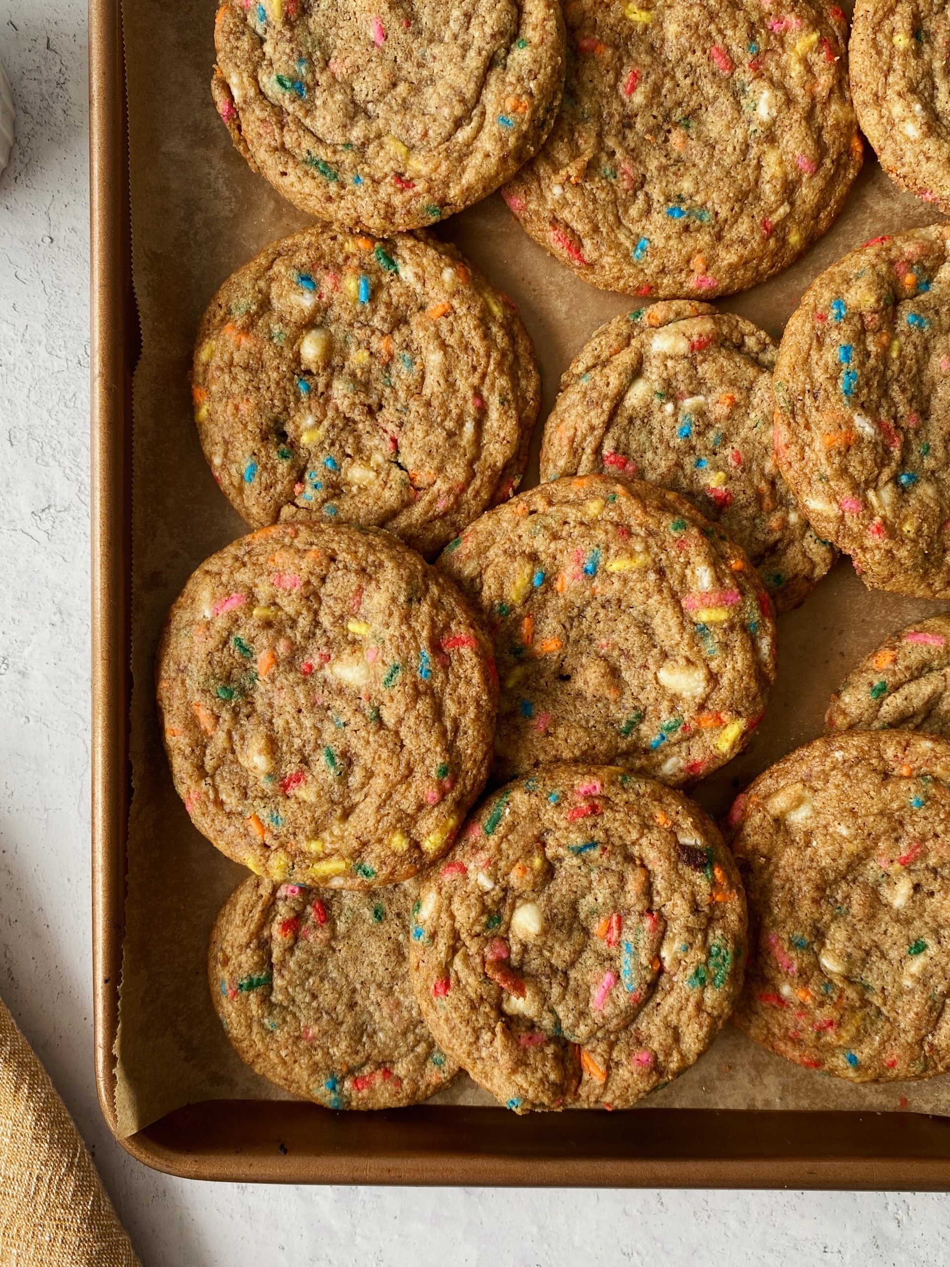 The best ever gluten-free Birthday Cake Cookies! Made with oat flour, sweetened with coconut sugar, and filled with delicious rainbow sprinkles and dairy-free white chocolate chips.