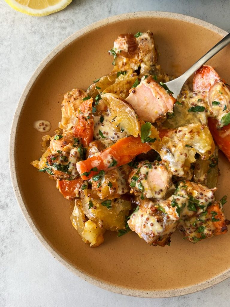 Honey mustard salmon bites with veggies is a flavorful one-pan meal to prep for dinner this week. Potatoes, shallots, carrots and salmon are spiced and baked then top with a delicious honey mustard sauce.