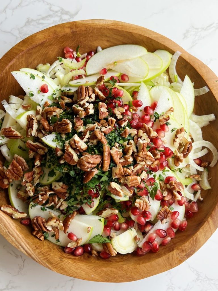 Fennel apple salad with pomegranate seeds, pecans and a zesty lemon dressing. This fresh and tangy salad is a delicious side dish to pair with any meal.