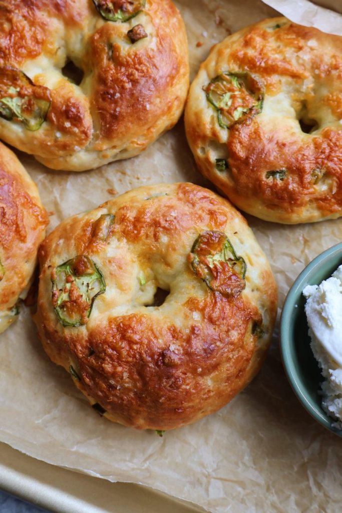 Ready in under 30 minutes, these greek yogurt jalapeno cheddar bagels are the perfect make-ahead breakfast to have on hand for the week. The dough is made of yogurt, all-purpose flour, baking powder and salt, then mixed in with some diced jalapenos and shredded cheddar cheese.