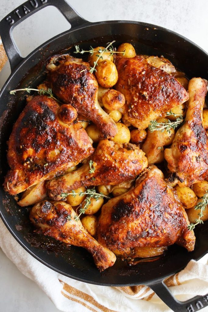 The chicken, potatoes and shallots get seasoned with a simple spice blend, then topped with a honey dijon marinade which adds the perfect flavor to this dish. I love using bone-in, skin-on chicken thighs or drumsticks for a juicy chicken with maximum flavor.
