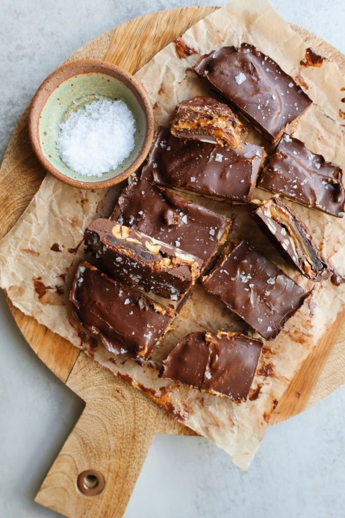 Sweet, salty and crunchy all in one. These 20-minute date and nut candy bars are such a simple yet delicious treat made with layers of melted chocolate, smashed medjool dates, crunchy nuts, creamy almonds butter and flakey sea salt.