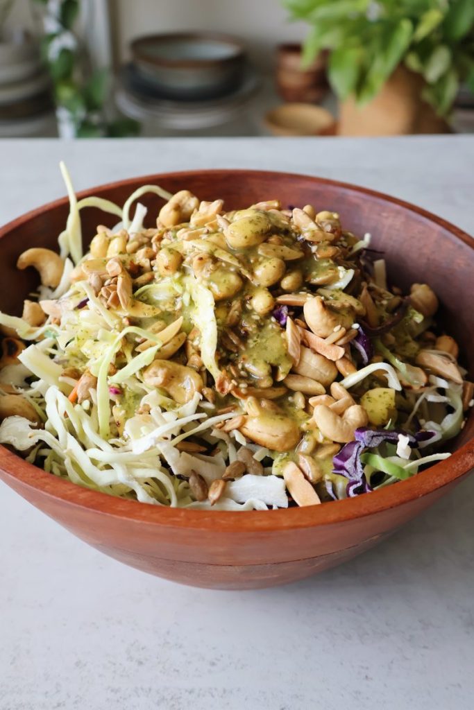 Crunchy cabbage salad with honey mint vinaigrette combines a fresh and zesty dressing with shredded cabbage and toasted nuts & seeds.