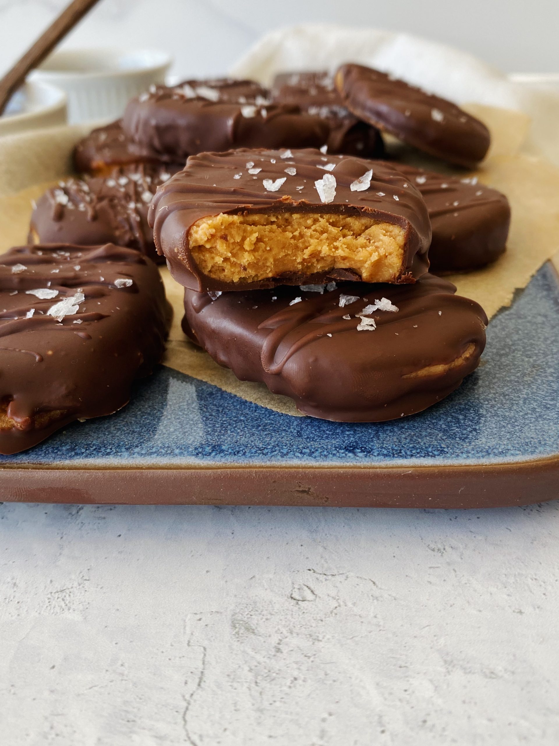 These peanut butter eggs have the perfect taste and texture, and are just like the real deal. A rich peanut butter filling that’s coated in dark chocolate and topped with sprinkle of sea salt- it doesn’t get much better than that. Feel free to shape them into pumpkins for Halloween!