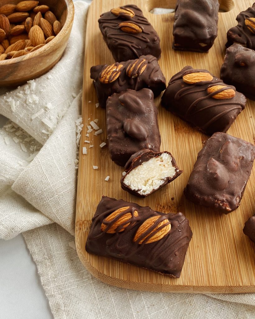 Last but not least, homemade almond joy! A delicious coconut bar topped with whole almonds, and coated in melted chocolate! They’re vegan, gluten-free, and and made with just 7 simple ingredients.