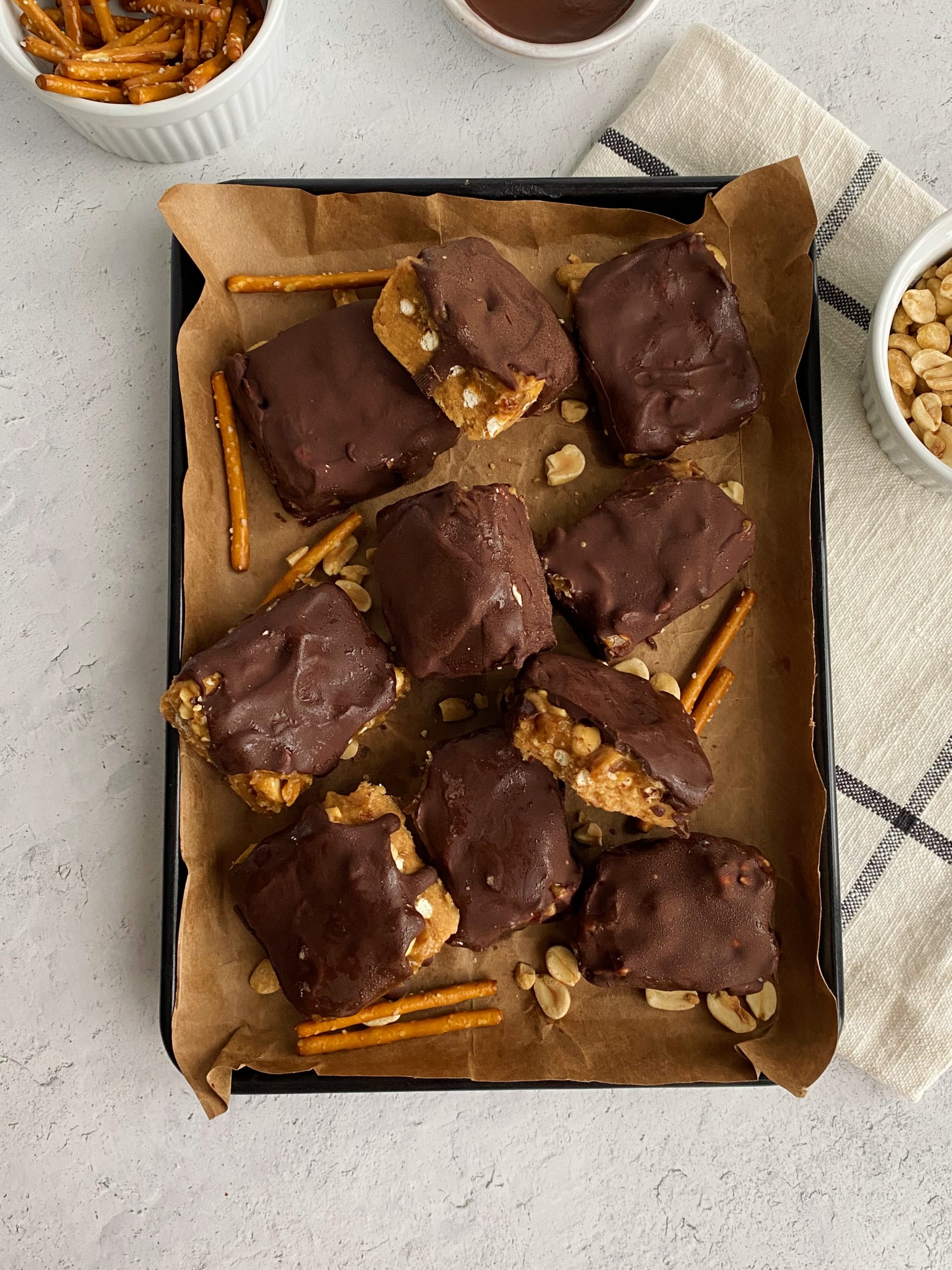 One of my oldest candy recipes- vegan Take 5 Bars! This 5 layer chocolate bar is made with peanut butter, pretzels, date caramel, peanuts, and dairy-free chocolate.