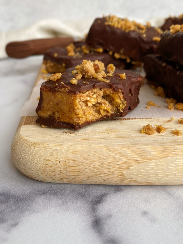 Crunchy and sweet homemade butterfingers! Made with only 6 simple ingredients, and coated in dairy-free chocolate. Trust me, you won’t even miss the real version.