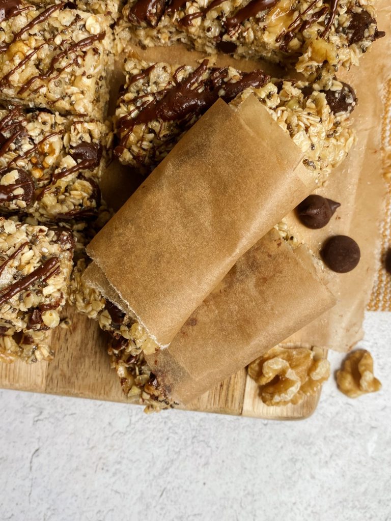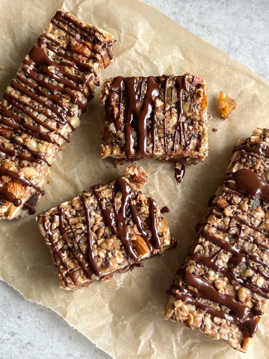 - Melt the chocolate chips and coconut oil until smooth then drizzle over each bar.