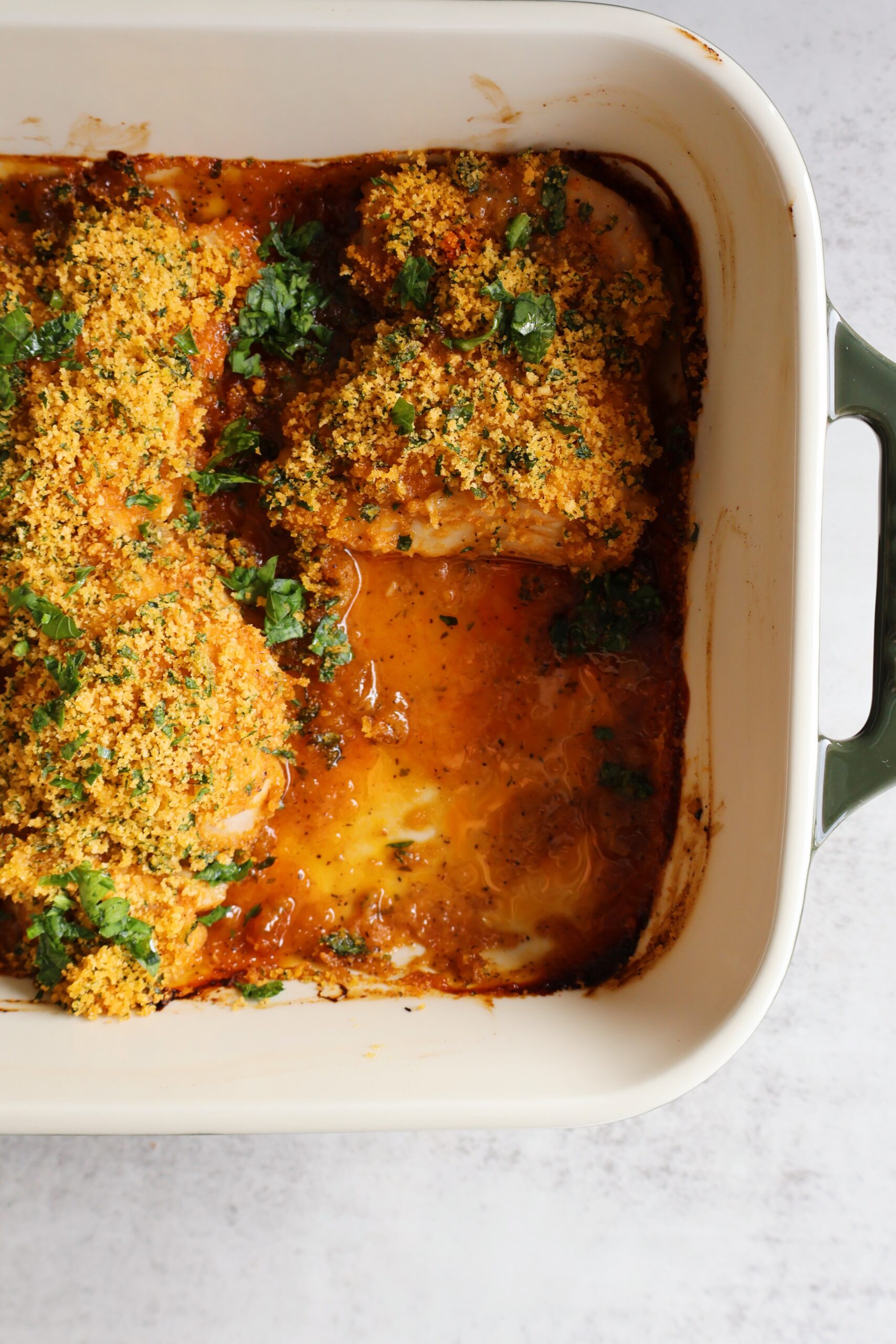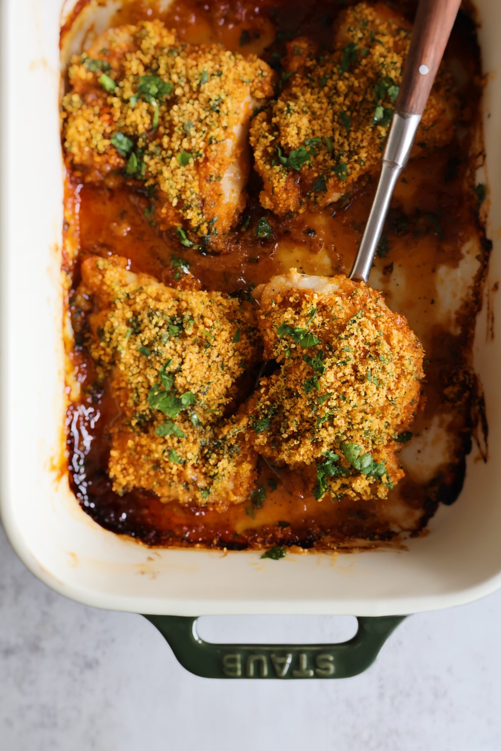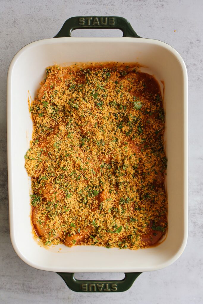 The chicken comes out tender and so flavorful, it just melts in your mouth. I love the added texture the breadcrumbs give in this recipe, so be sure not to skip them! You can easily substitute a gluten-free breadcrumb mix if you wanted to keep this gluten-free friendly.