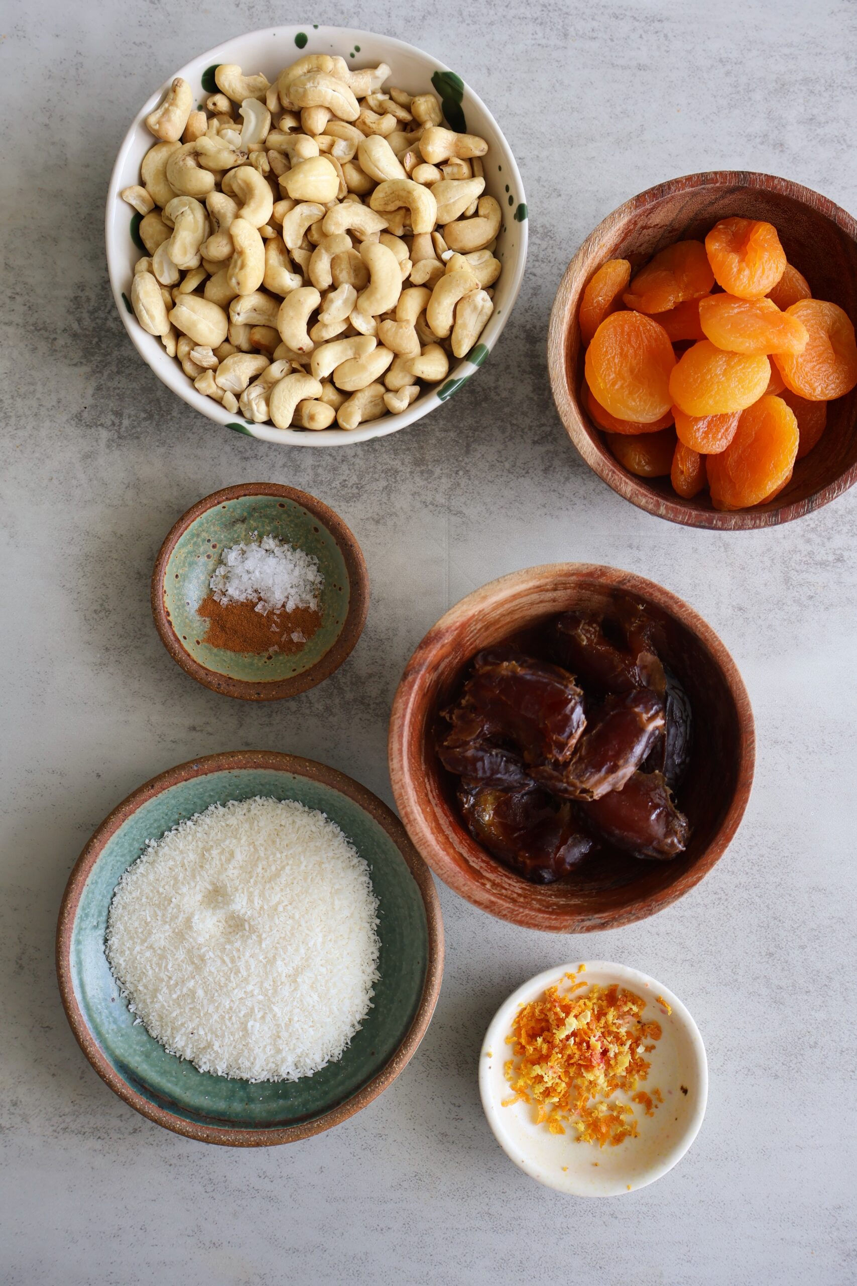 These energy bites have hints of orange zest and cinnamon, with just the right amount of tang from the apricots. The cashews offer a subtle, cookie-like flavor and crunch, and the medjool dates add a touch of sweetness while helping bind the mixture.