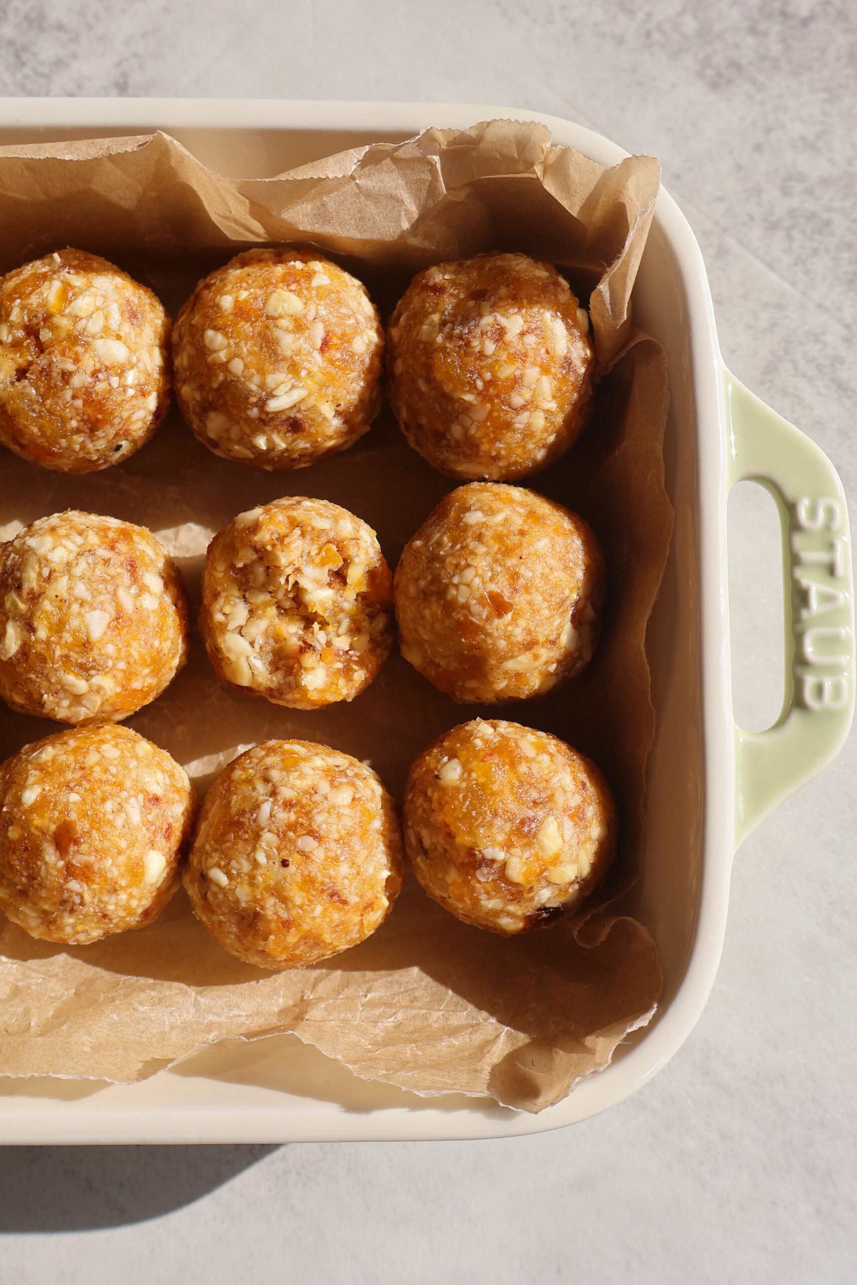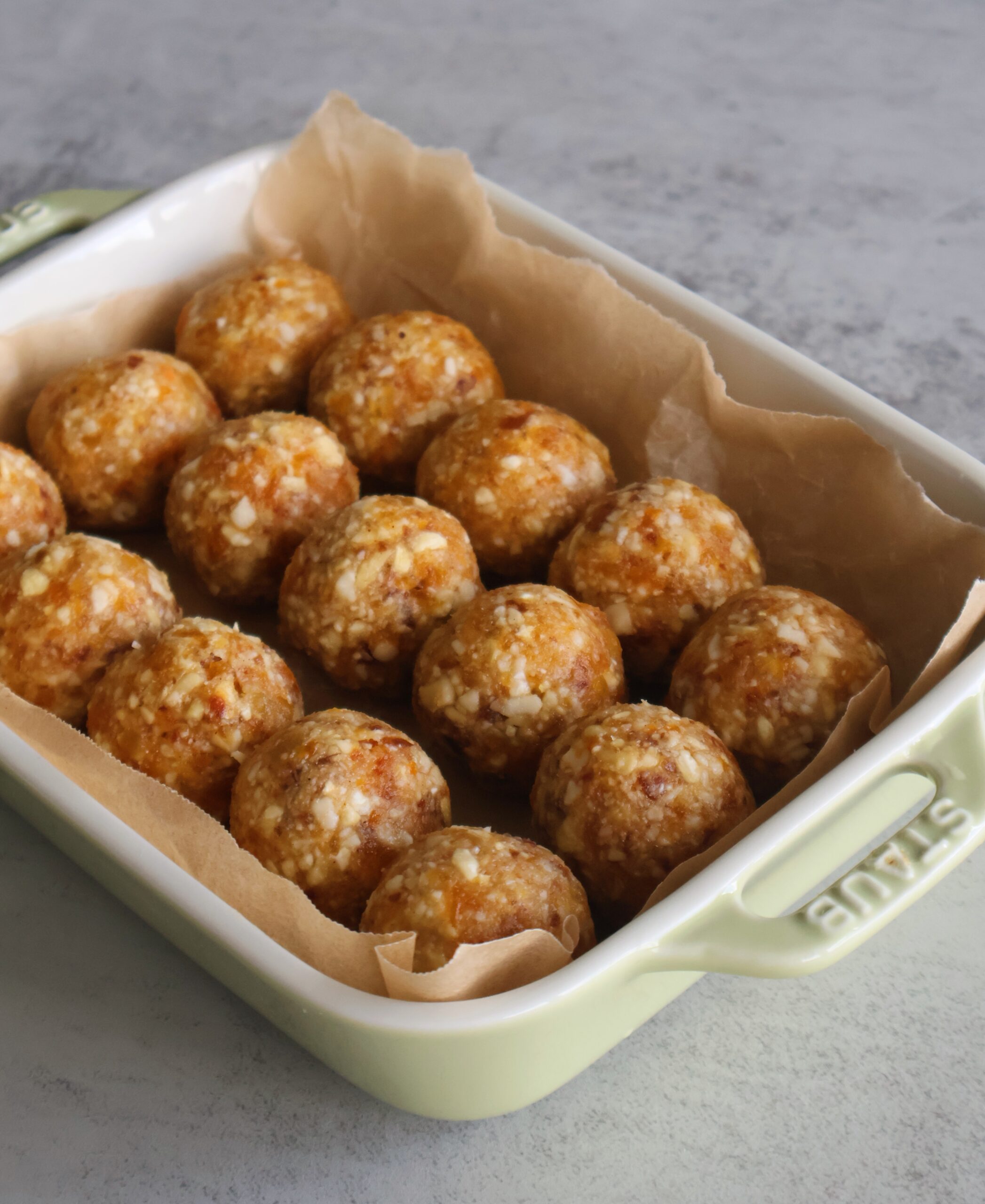 - With wet hands, scoop out about 1.5 tbsp of the mix to roll into balls, then place onto a parchment lined tray or baking dish. Refrigerate for at least 30 minutes to harden.