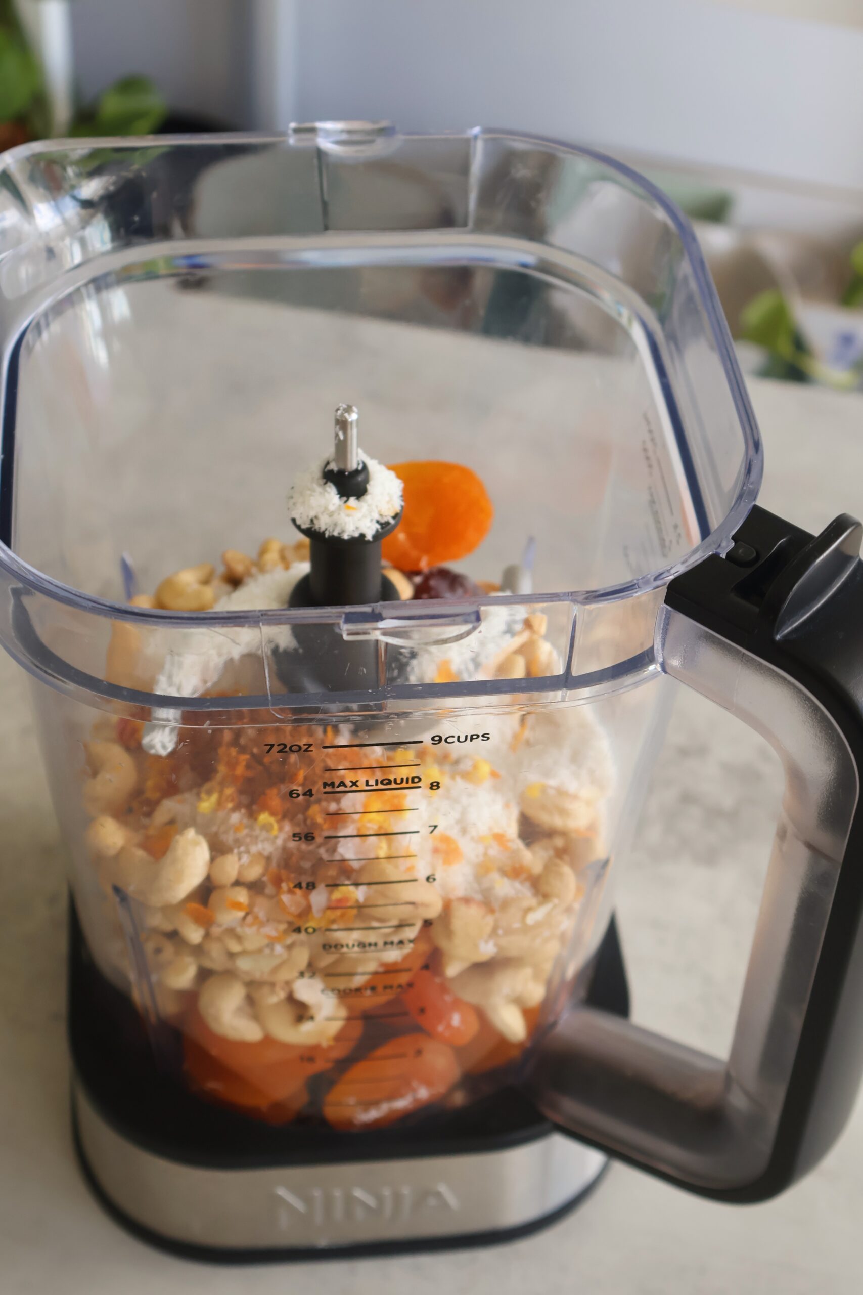 - Add all of the ingredients to a food processor or high speed blender, except for the water, and pulse together to finely chop the dried fruit and nuts.
