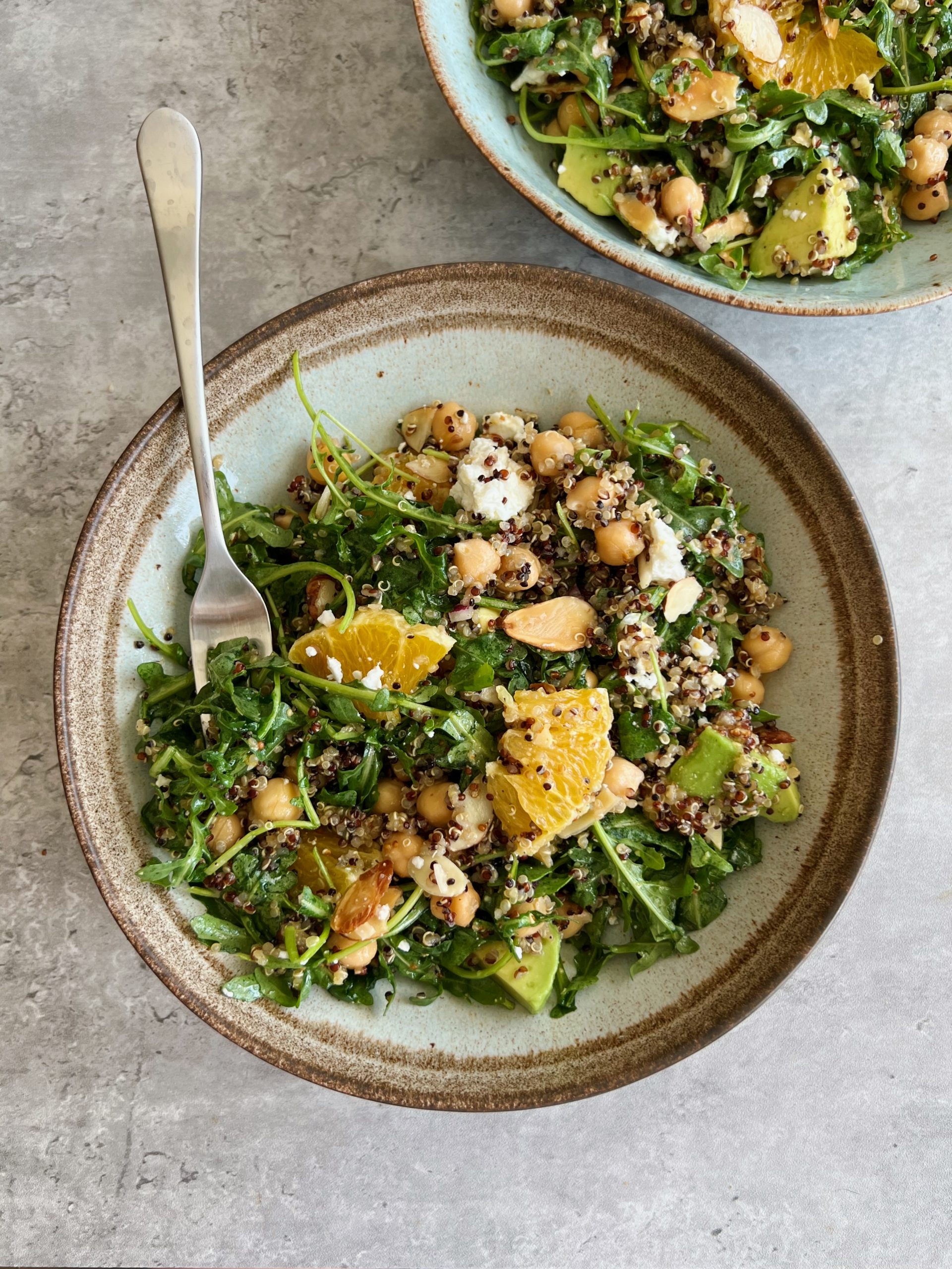 This crisp arugula citrus salad is topped with chickpeas, quinoa, fresh orange slices, avocado, toasted almonds and feta cheese. It’s tossed in a delicious citrus vinaigrette, and is the perfect way to eat more veggies!