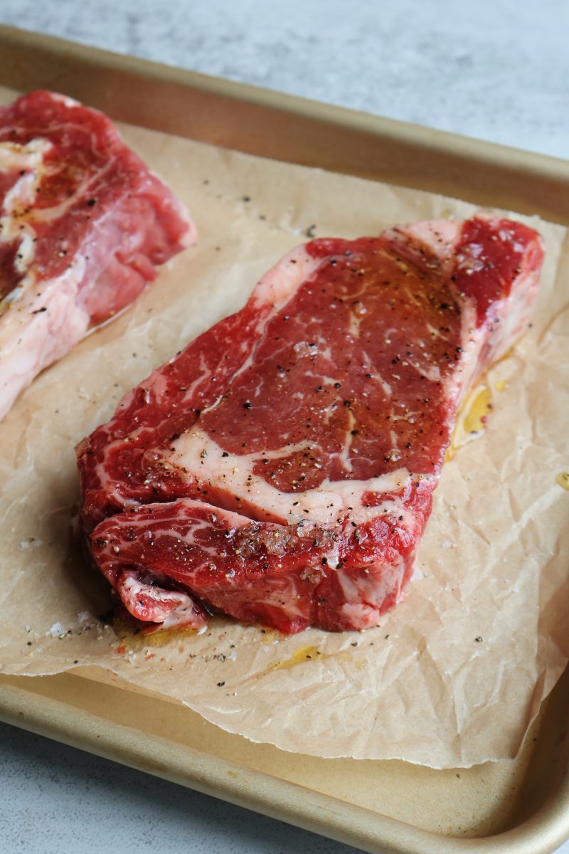 A well-marbled ribeye is ideal for best flavor. Start by seasoning the steak with salt and pepper on both sides. You’ll want to let the steak sit at room temperature for 20-30 minutes so that it cooks evenly.