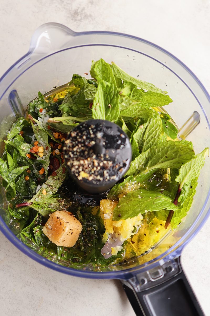 - Prepare the mint dressing by adding the inrgedients to a blender or food processor and blending until smooth.