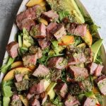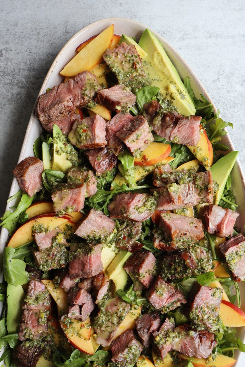 - Top with sliced peaches, sliced avocados and your cut up steak then pour the remaining dressing over the top and serve.