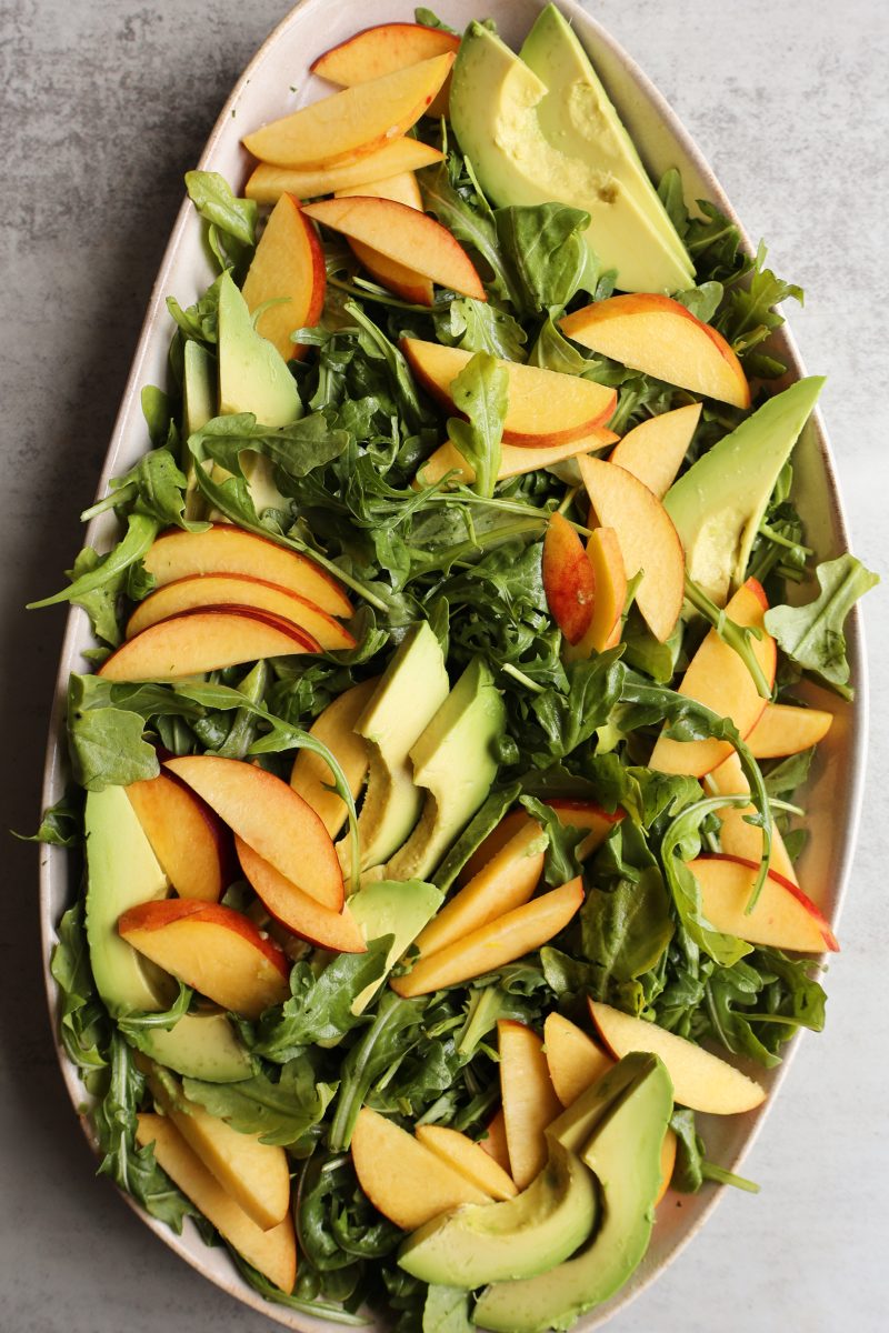 - Plate the arugula and mix in half of your dressing. Top with the sliced peaches, avocado and cut up steak