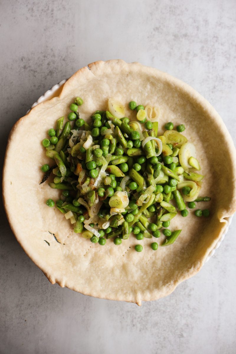 The filling of the quiche is made from blended eggs, cheese and cottage cheese that get mixed together with sauteed asparagus, leeks and peas. Everything gets baked in a flakey pie crust until browned, leaving you with a delicious and filling dish.