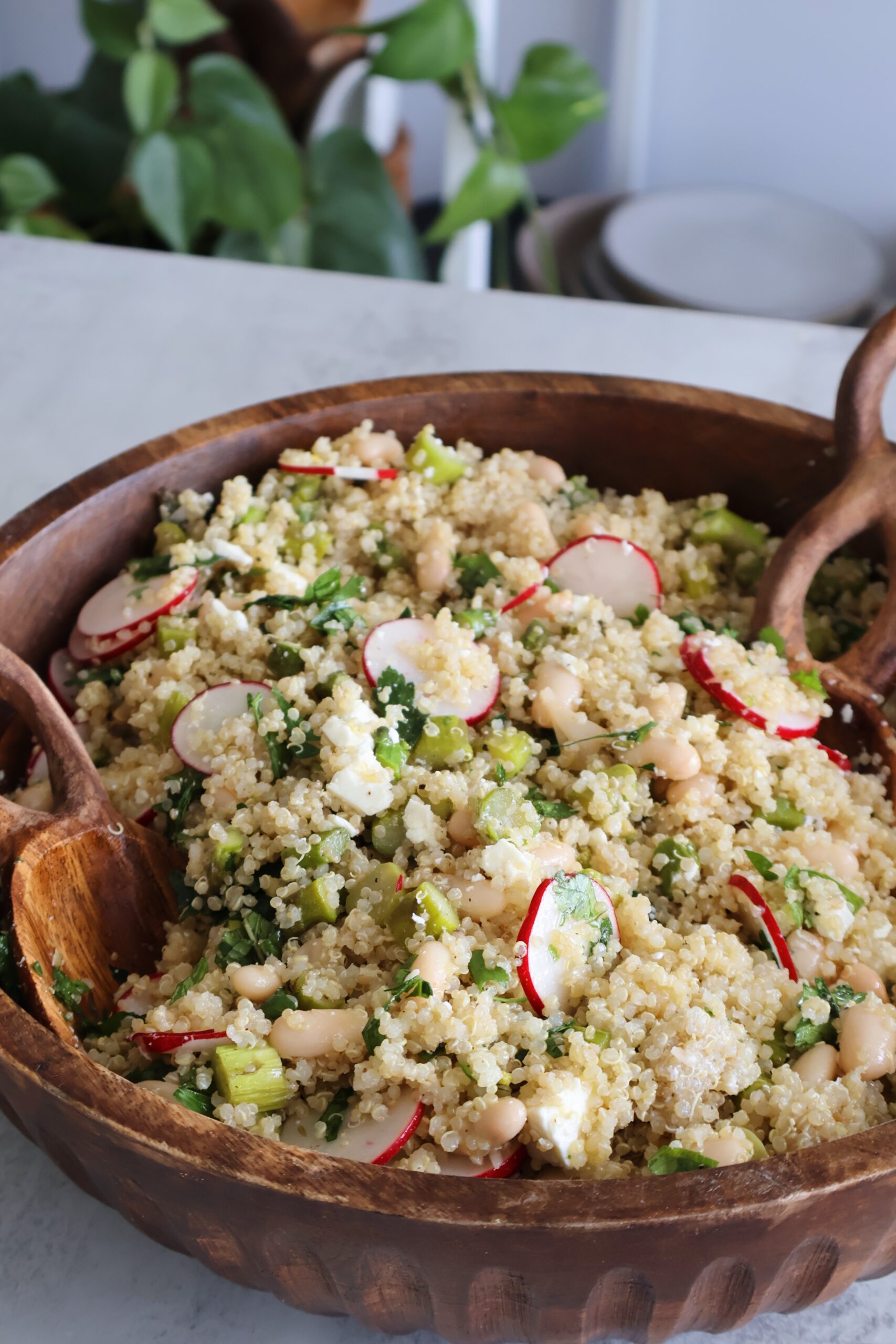 - Add the fluffed quinoa to a large salad bowl with the sauteed asparagus, beans, sliced radishes, feta cheese and chopped herbs. Toss together with the lemon dressing. Taste and adjust salt & pepper if needed.