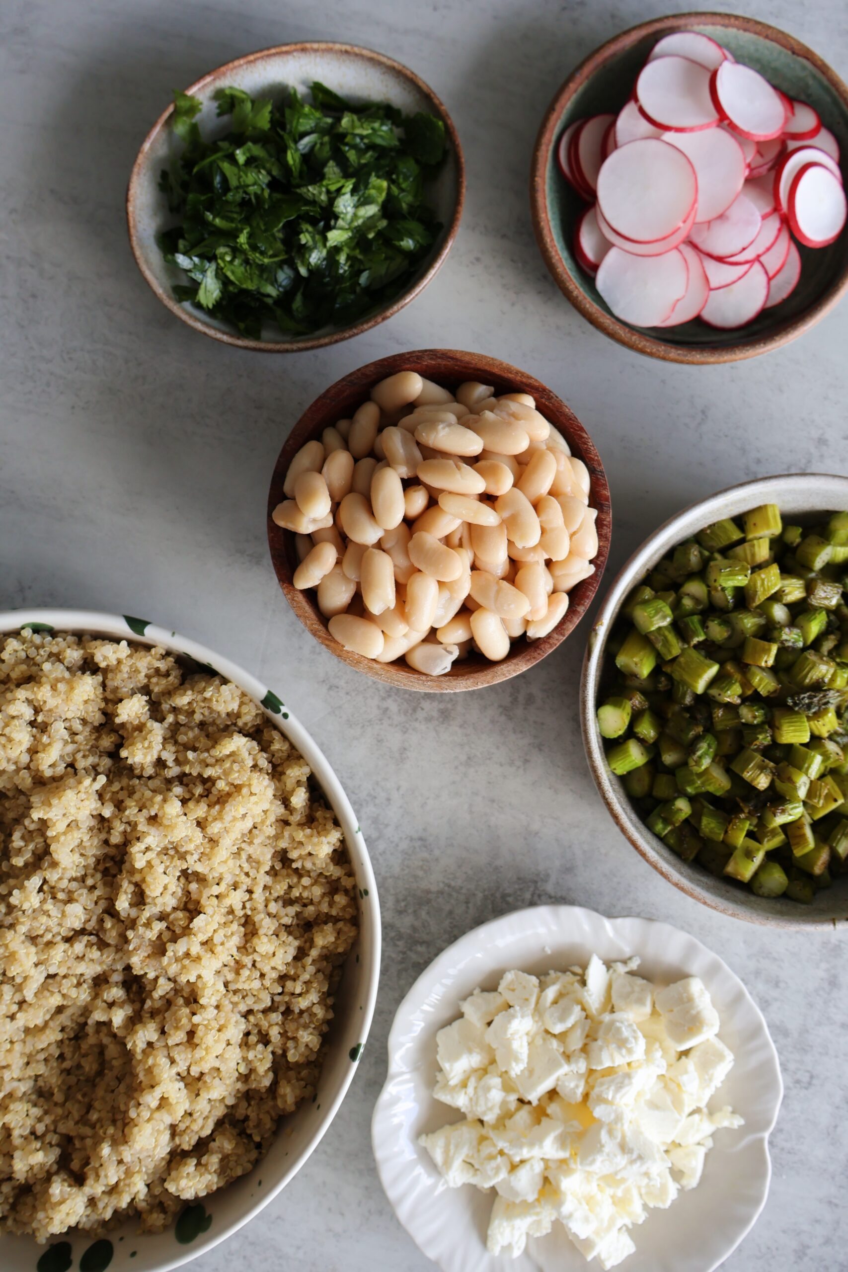 - Assemble the salad with the fluffed quinoa, asparagus, beans, chopped herbs, sliced radish and feta cheese