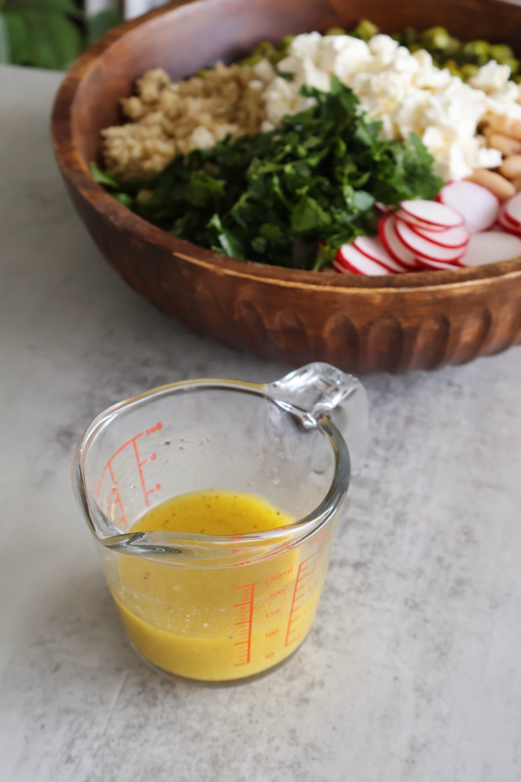 - Prepare the lemon vinaigrette by combining the dressing ingredients together in a bowl or jar, and shaking together or whisking until smooth