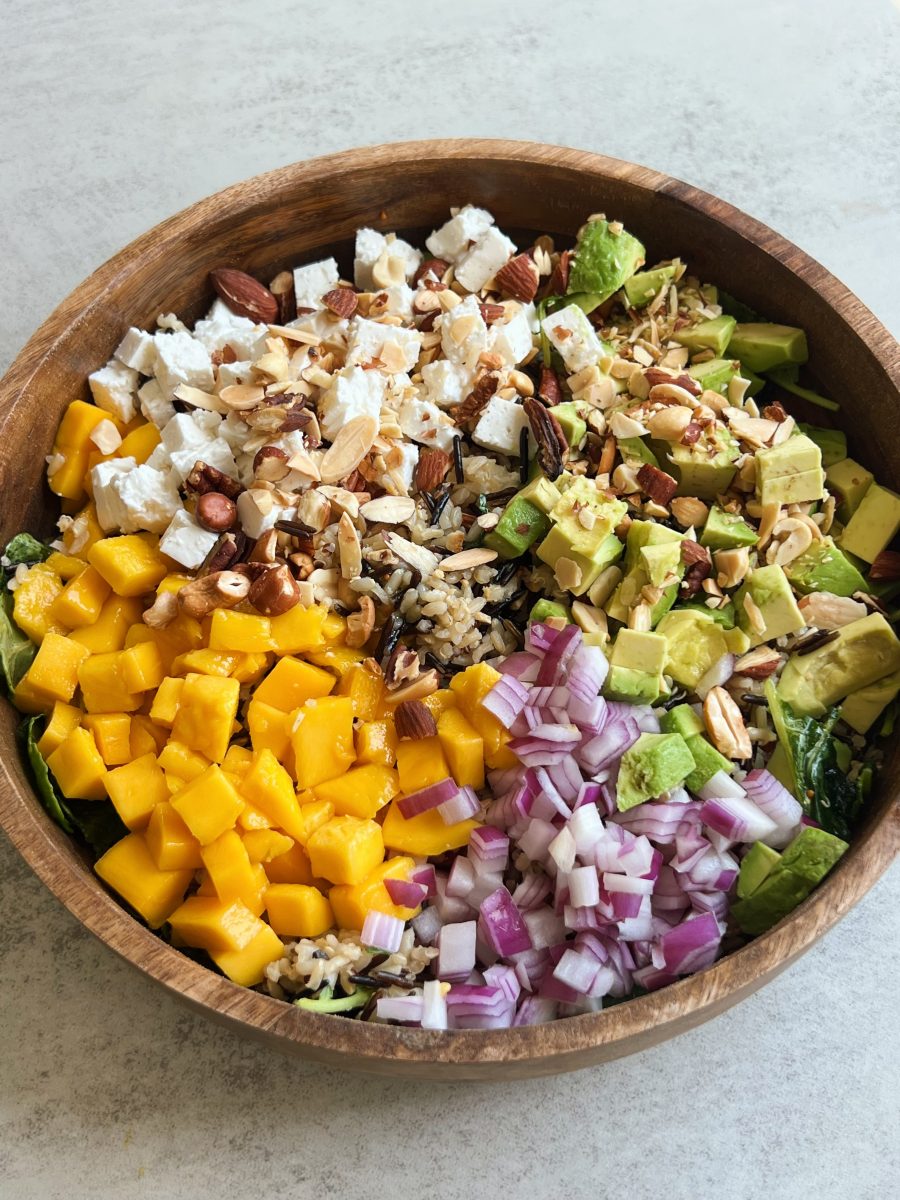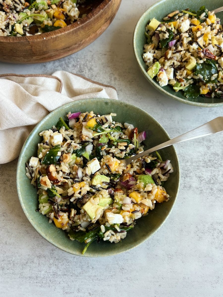 Avocado & mango wild rice salad is a nourishing side dish loaded with all the delicious flavors! Made with wild rice, crunchy nuts, sweet mango and savory feta cheese with a simple citrus vinaigrette.