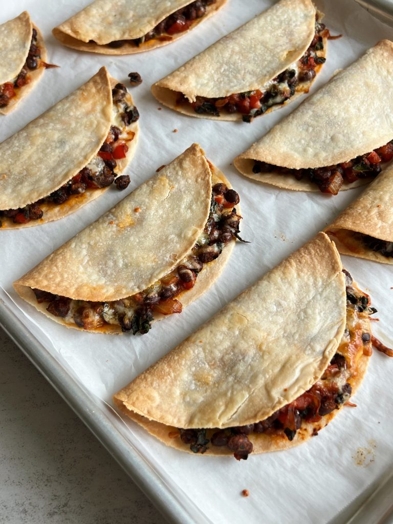 The beans get cooked with the veggies and spices, stuffed into tortillas with shredded cheese, then baked until crisp.