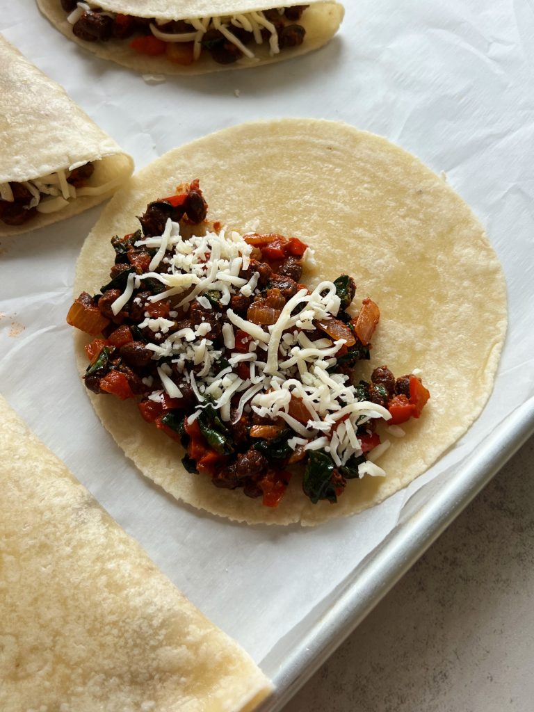 - Add a layer of the black bean mix to half of each tortilla, top with shredded cheese then fold the tortillas over and press them down.
