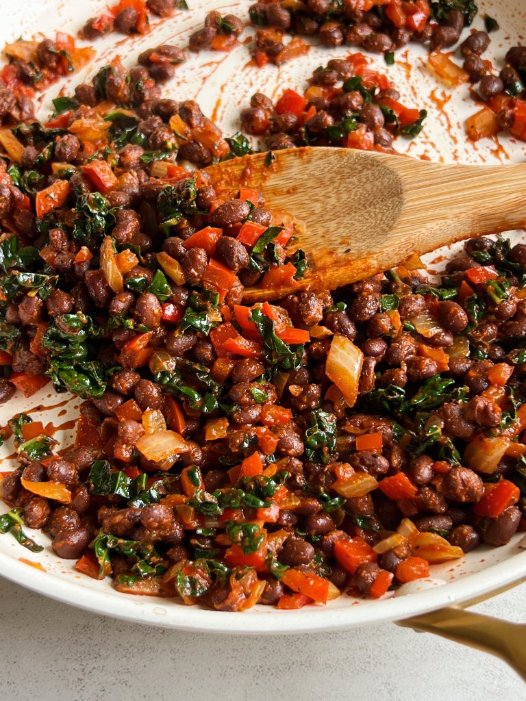 - Start by sauteeing the veggies until they’re soft, then adding in the beans, kale and spices