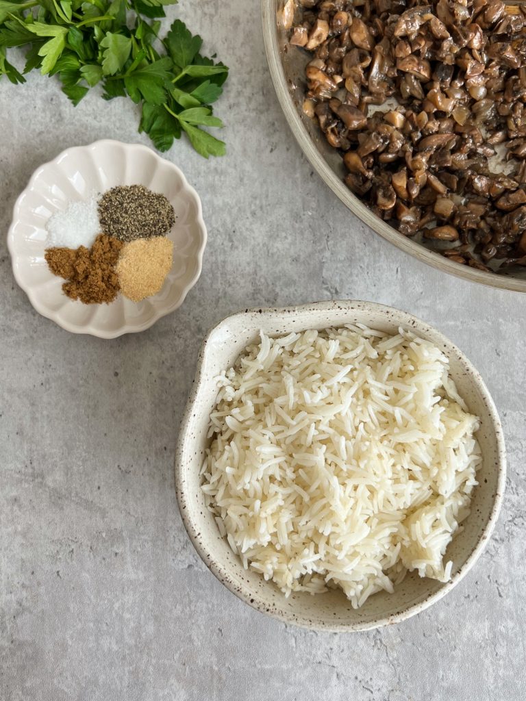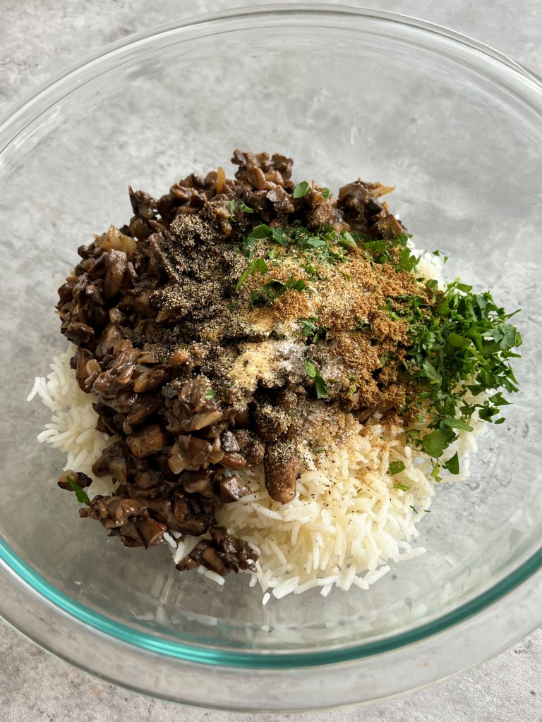 - One the mushrooms cooked down, add them to a bowl with the cooked rice, seasoning, parsley, eggs and flour. If using leftover refrigerated rice, I suggest warming in the microwave before mixing it in.
