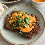Balsamic mushroom rice fritters are a delicious appetizer or side dish to make with leftover rice! Served with a creamy red pepper tahini sauce for the perfect flavor combination.