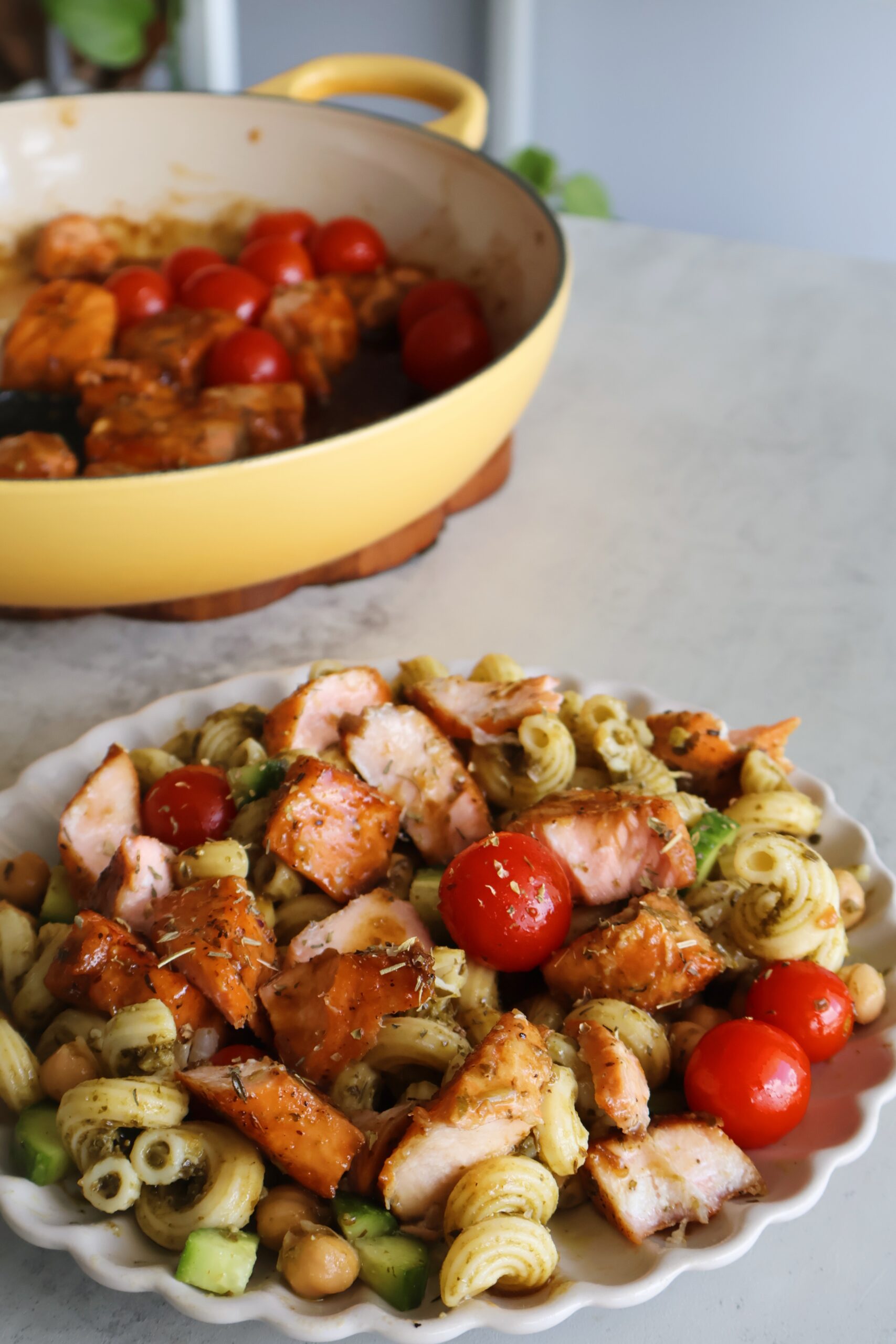 The salmon bites are seasoned and pan-seared until browned, then finished off in a sweet and tangy balsamic sauce. The salmon stays tender, and pairs so well with fresh tomatoes and chopped basil.