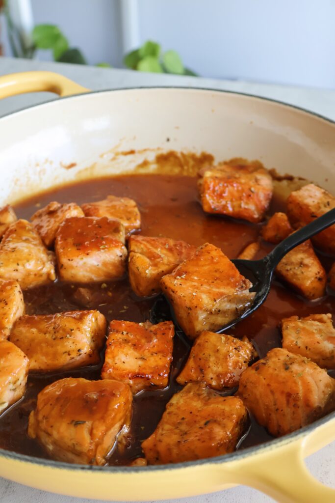 - Using a paper towel, soak up some of the oil from the pan. Pour the marinade into the pan and spoon over the salmon bites. Cook on a medium/low flame until the glaze thickens and bubbles, for about 3-4 minutes.