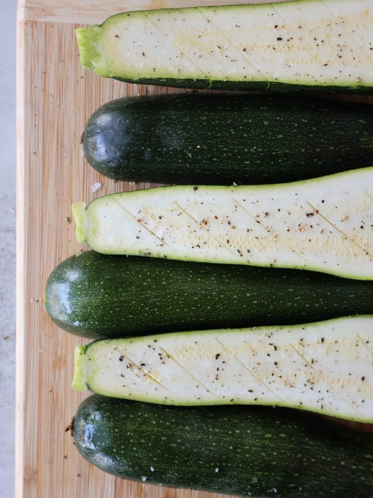 - Slice off the stem from the zucchini and cut in half lengthwise. Lay the zucchini cut side up on your cutting board. Using the tip of your knife, score the zucchini with about 5-6 cuts diagonally, making sure not to cut through the zucchini.