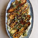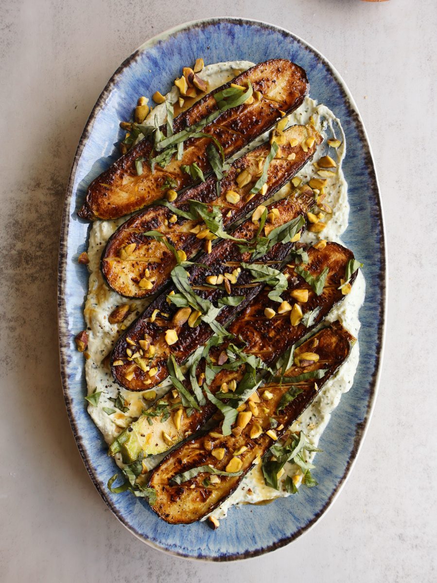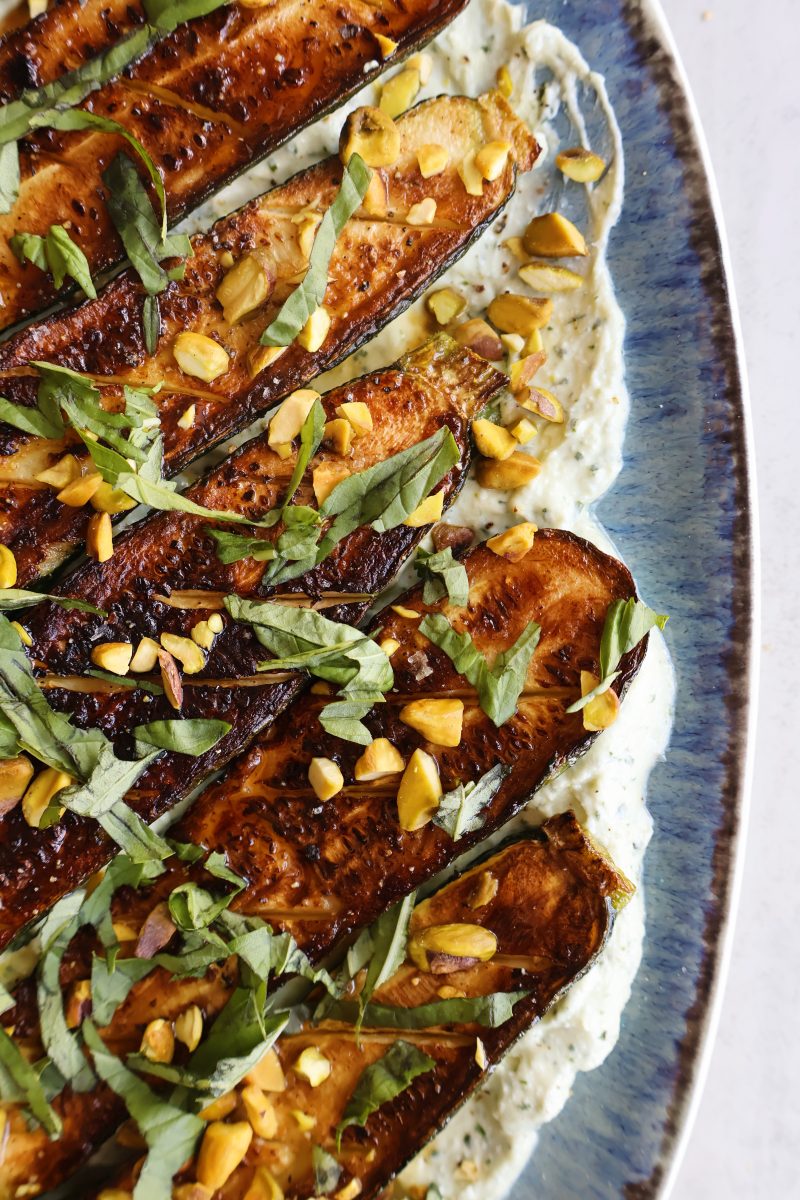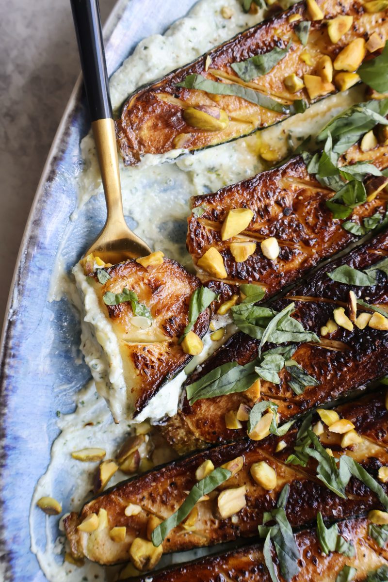 - Spread the whipped feta onto a serving platter and top with the seared zucchini