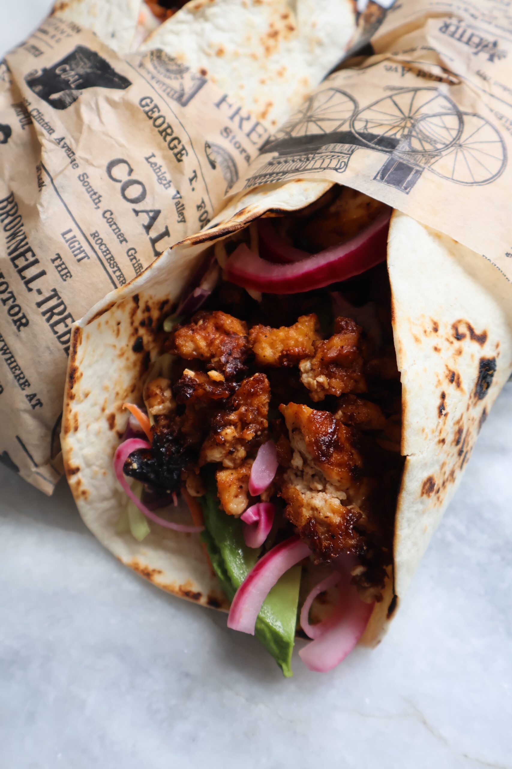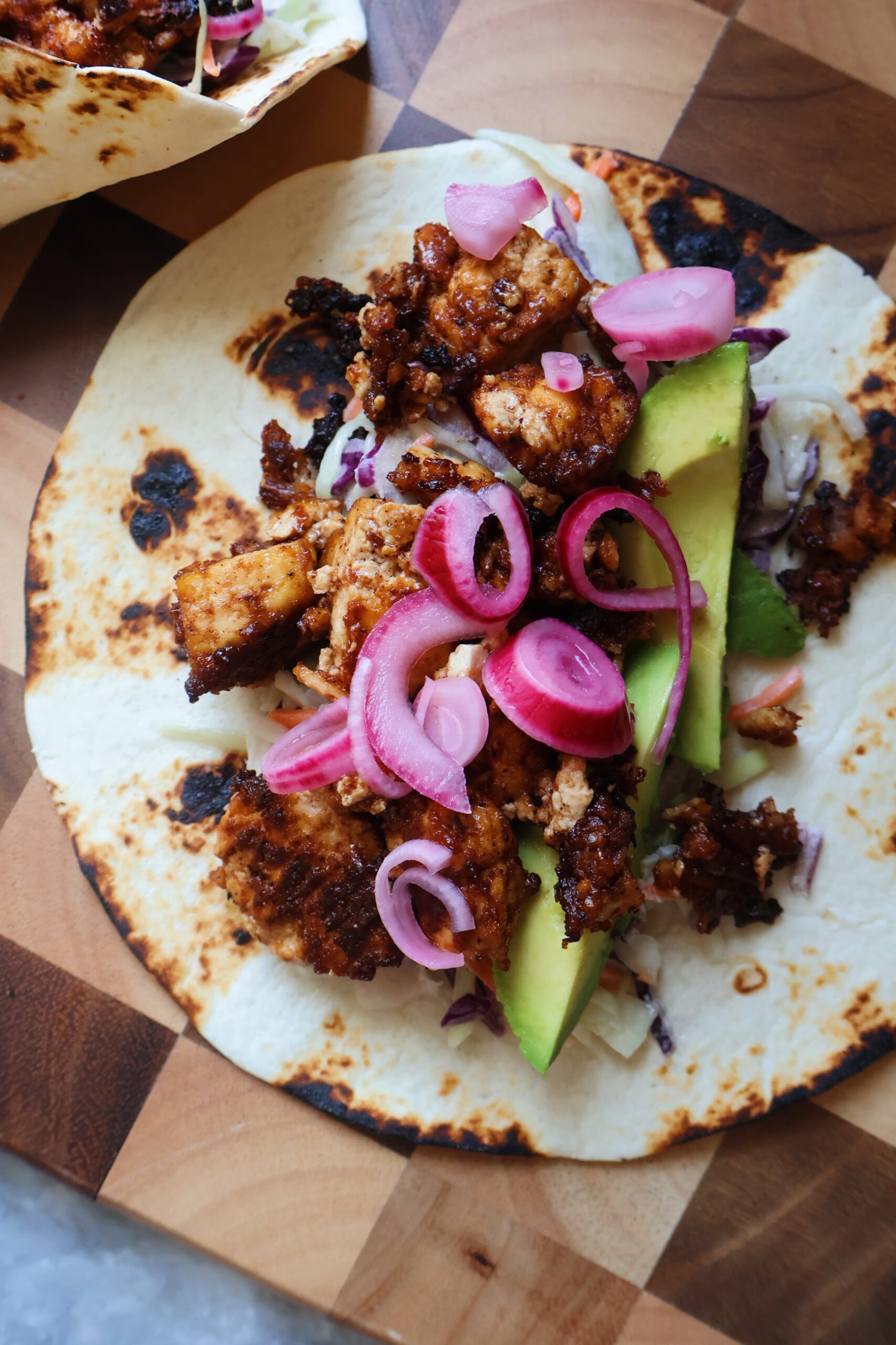 This recipe can easily double as meal prep if made ahead of the week. The tofu, pickled onions and cabbage slaw will stay fresh in the fridge for a few days, so you can assemble the wraps when ready to serve, or enjoy this recipe as a bowl over rice or your favorite grain.