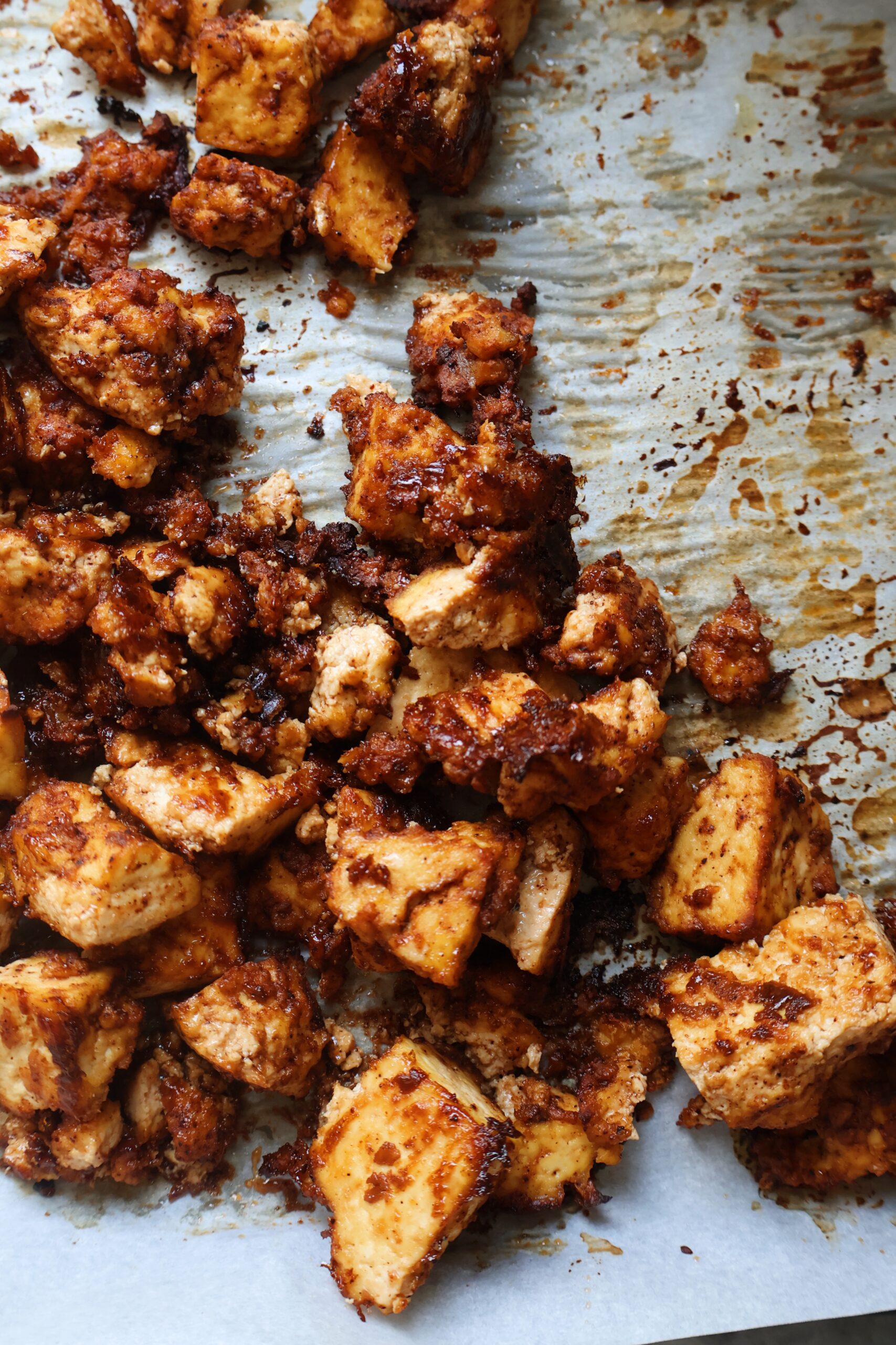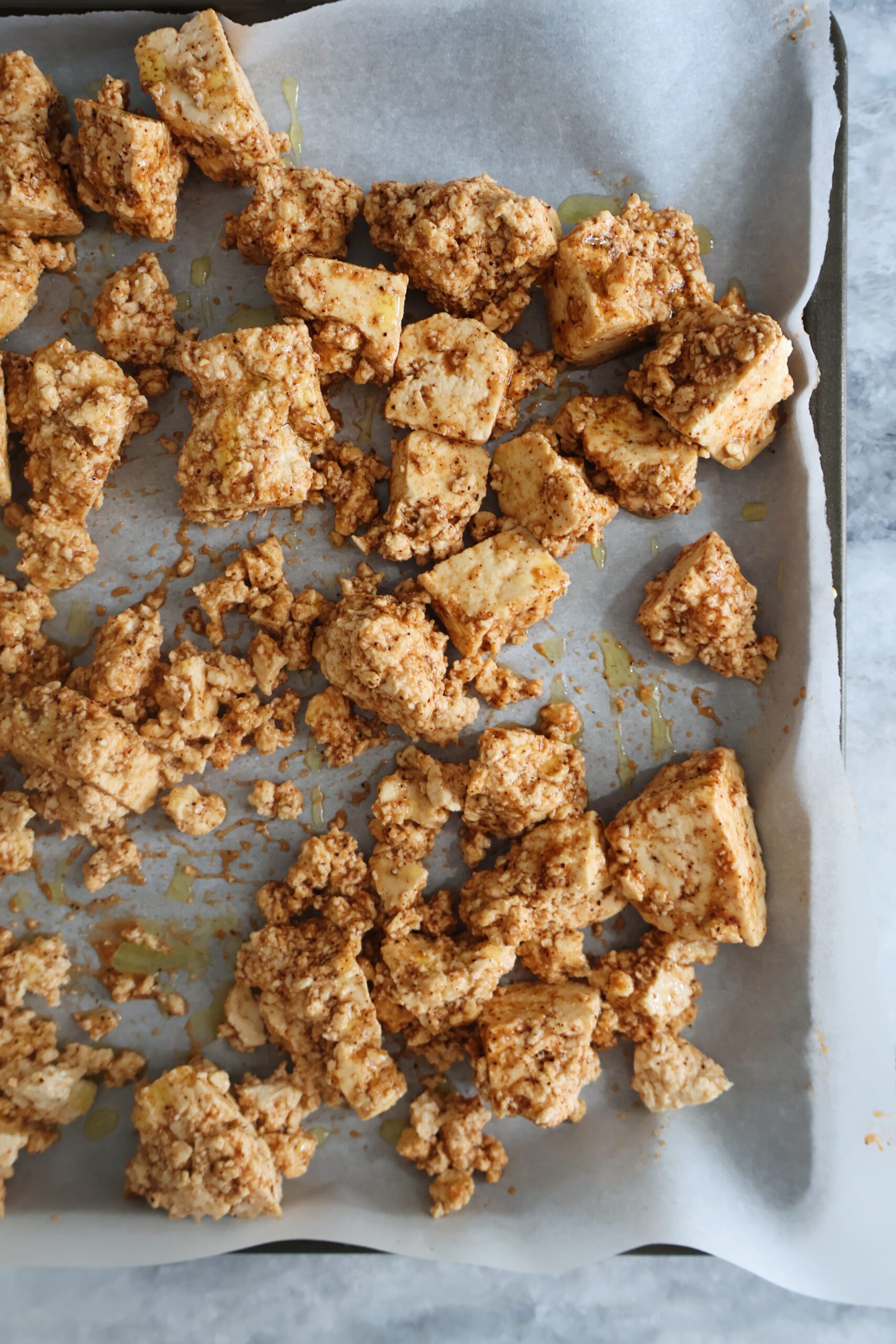 - Transfer the tofu to a parchment lined sheet-pan and drizzle with 2 tbsp of olive oil. Bake for about 35-40 minutes, flipping halfway through.