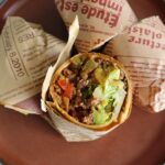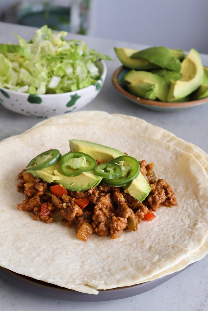 - Once the beef is cooked, assemble your burritos with a layer of the meat and veggie mix, shredded lettuce, avocado and your pickled jalapenos. Fold in the sides and roll the bottom up to wrap tightly.