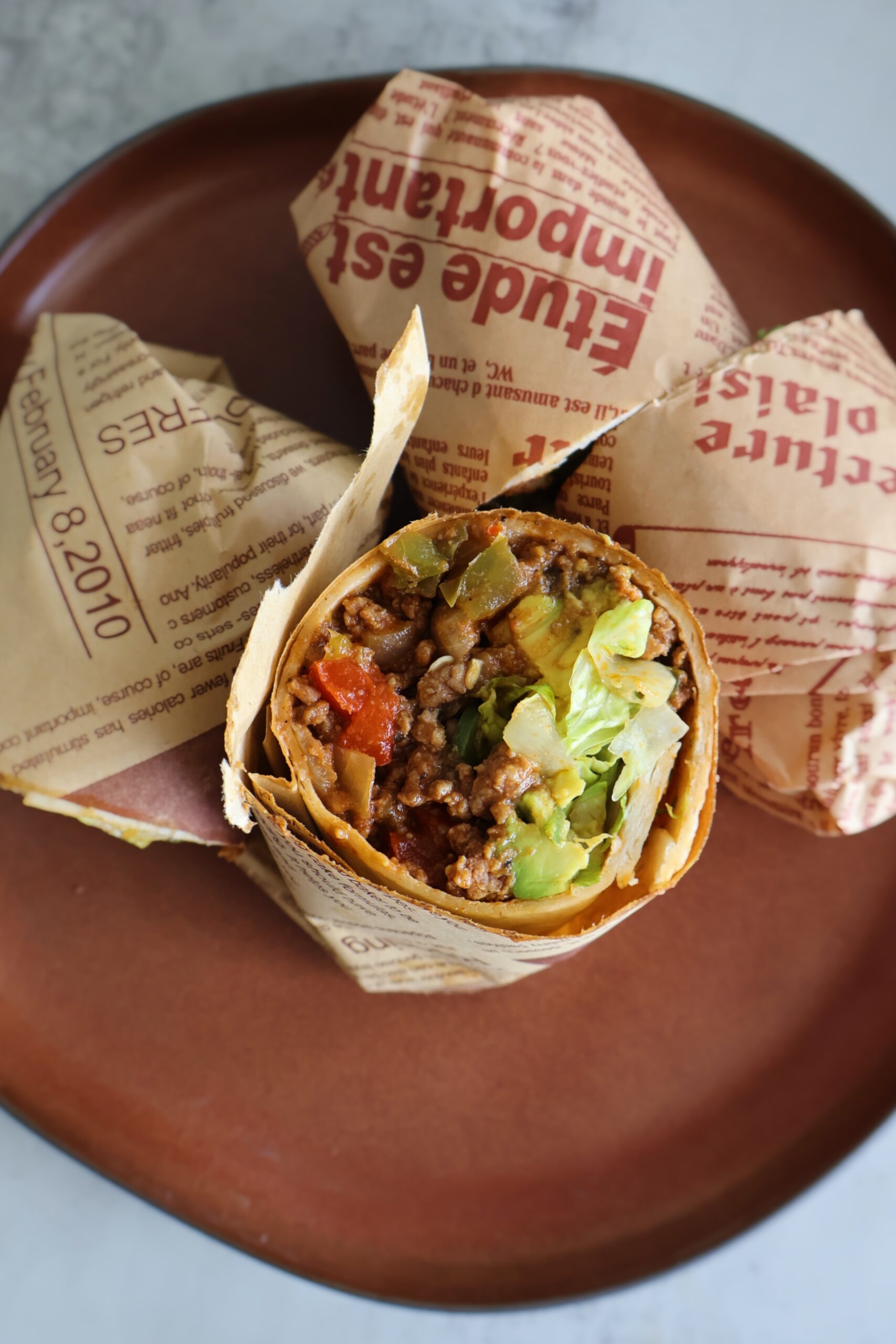 These burritos are so customizable, with countless variations of vegetables and protein that can be used. They’re made with sauteed peppers and onion, ground beef with a homemade spice blend, and the simplest pickled jalapenos made with peach cider vinegar.