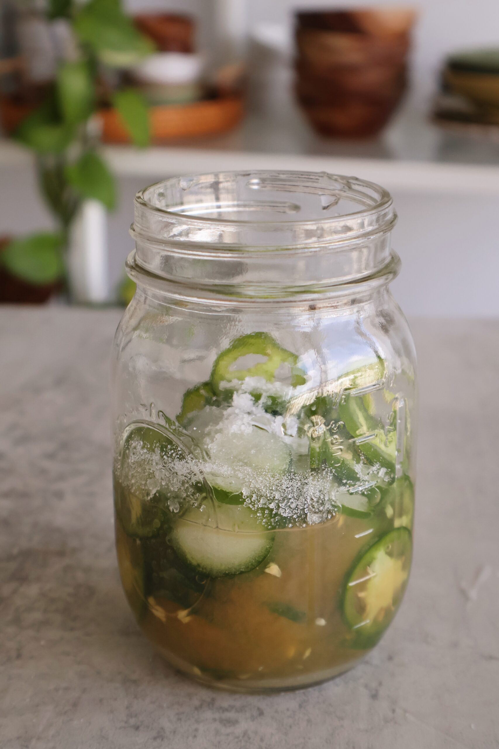 - Thinly slice the jalapeno peppers and add them to a jar with the peach cider vinegar, boiling water, sugar and salt. Shake to combine and let sit while you prepare your beef, for at least 30 minutes. For more flavor, prepare the jalapenos overnight or a few hours before.