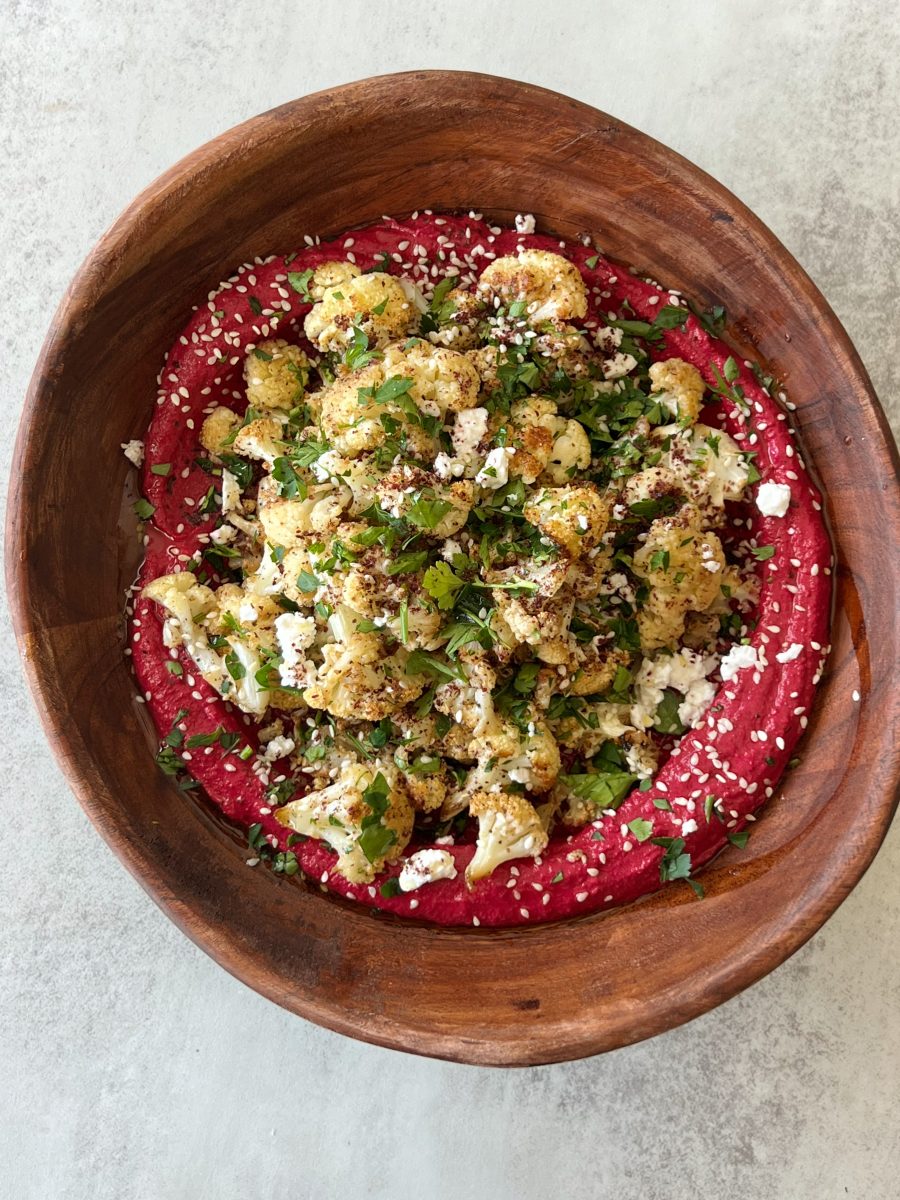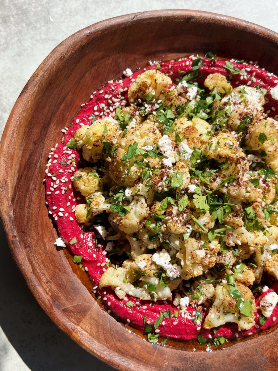 I don’t know about you, but I’m fully ready for spring. With warmer weather, brighter foods and overall better vibes it can’t come soon enough. We’re only a couple of weeks away, so I’m kicking things off with this delicious whipped beet feta with roasted cauliflower.