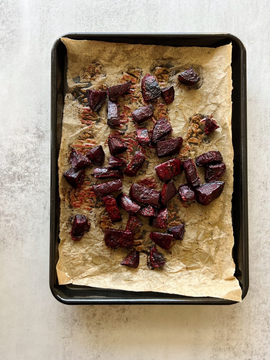 - Peel and chop the beets into 2″ pieces and toss in olive oil, salt & pepper. Bake for 30 minutes, or until fork tender