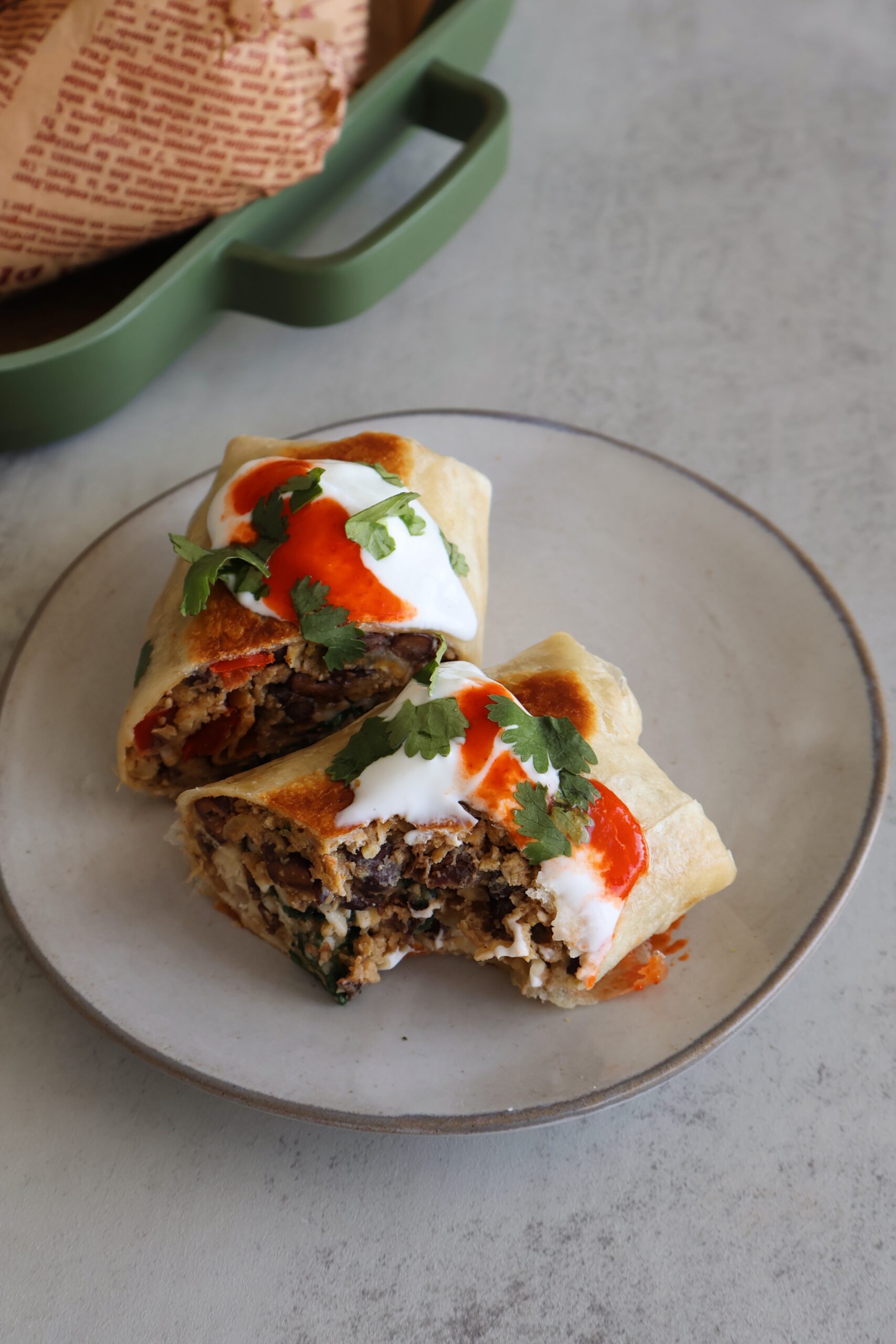 If reheating from the fridge, grill the burritos on a heated skillet with a little cooking spray, or bake or air-fry on 350 F for 5-7 minutes.