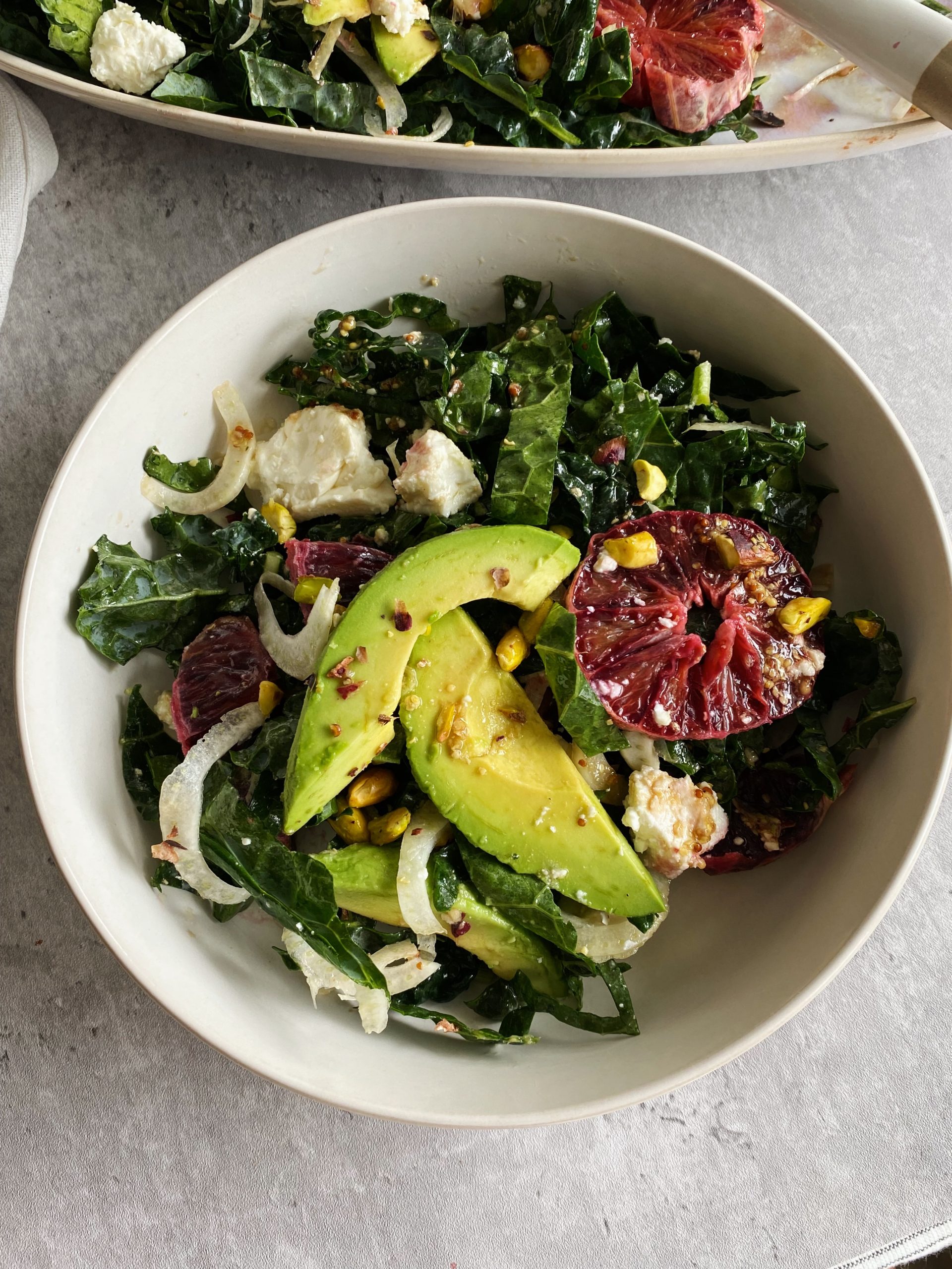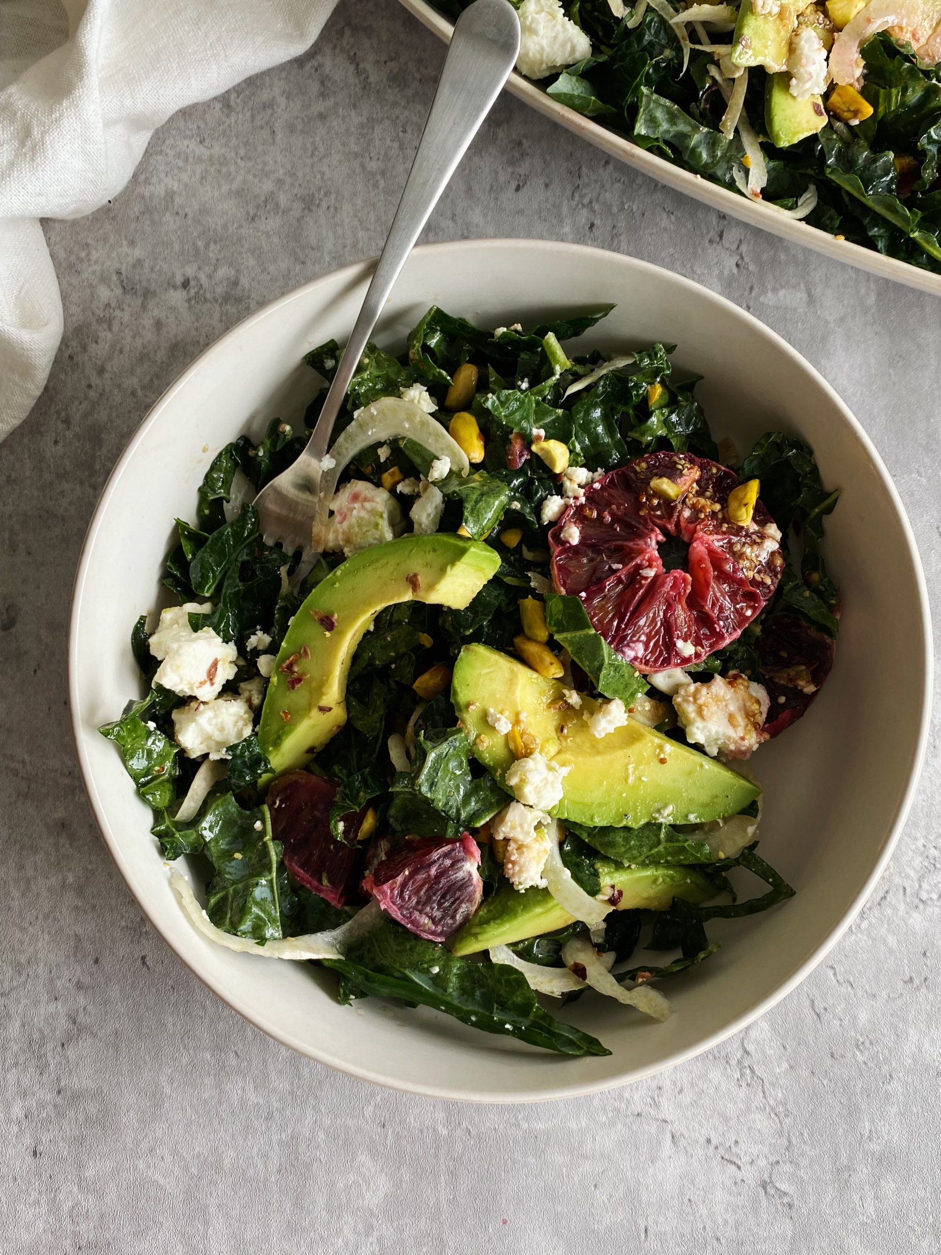 Its colors are gorgeous, and it’s filled with nourishing ingredients like tuscan kale, shaved fennel, blood oranges, and avocado.